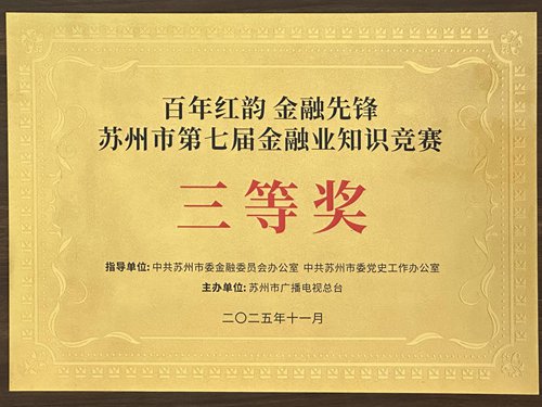 本次知识竞赛以“百年红韵金融先锋”为主题,强化党对金融工作的领导,为苏州金融行业注入红色动能。农银人寿苏州分公司选派青年员工陈厚帆、韩璐参加比赛,他们在比赛中沉稳应对、奋勇争先,最终荣获三等奖佳绩!