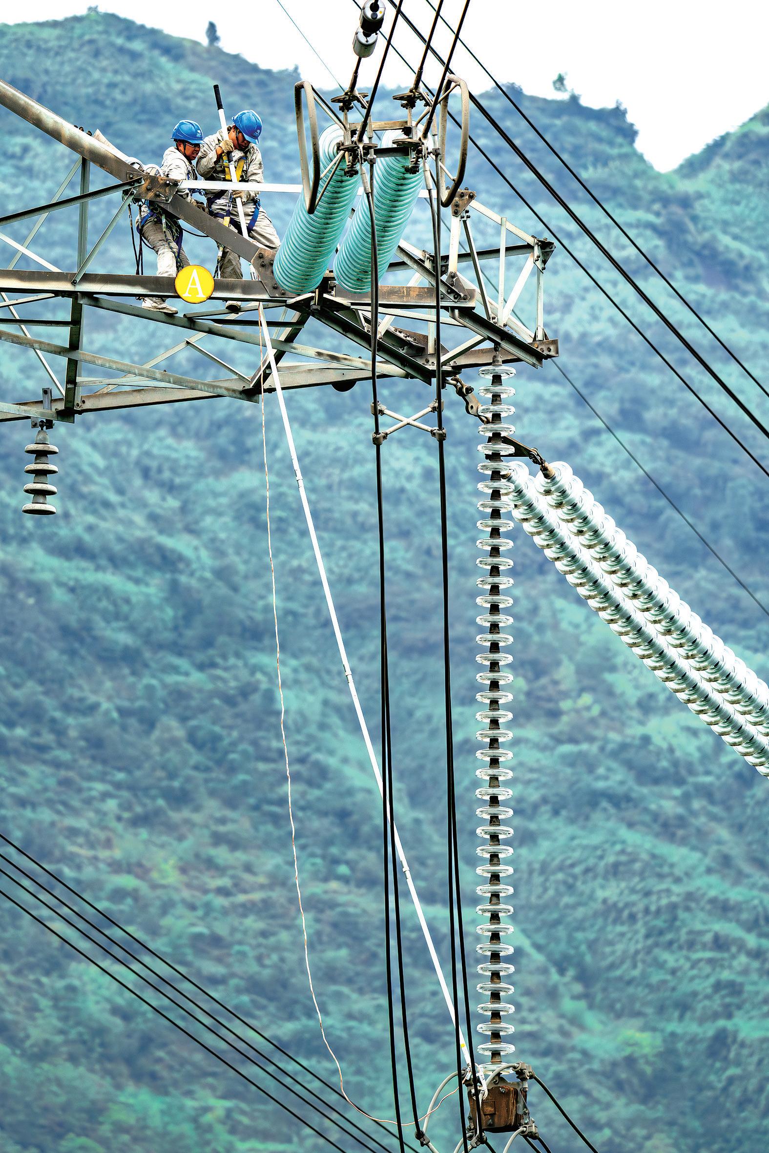 近日,南方电网贵州六盘水供电局工作人员在500千伏发八乙线(发耳电厂至安顺500千伏八河变)开展设备检修作业。此次作业重点推进补装金具销子、更换破损绝缘子等工作,全力保障这条“西电东送”关键线路安全稳定运行,为发耳电厂能源平稳外送筑牢供电保障防线。(通讯员王飞摄)