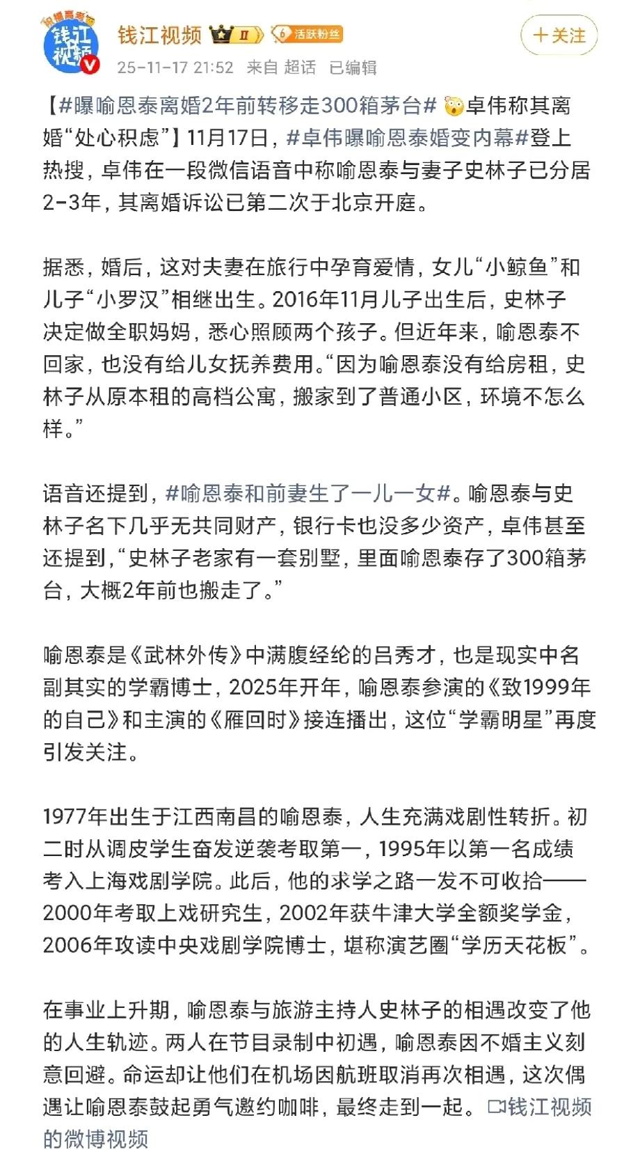 秀才喻恩泰离婚了,我不意外 搬走了别墅里300箱茅台,我也不意外 万万没想的是,他还不见孩子又拉黑妻子,甚至不给妻儿租房费用,抚养费用也不给了。 这真的挺离谱的,记得以前还营销过宠妻什么,结果现在连孩子的抚养费都不给,做事太绝了,而且没啥人性,对孩子都不负责。 俩人结婚这么多年,竟然名下一点共同财产都没有,合着早就转移了,3百箱茅台都价值300多万了吧。 他的妻子是旅游主持人史林子,多年前他们在飞机上相遇,后来感情升温,原本不婚主义的喻恩泰决定结婚。 后来妻子生了两个孩子,做了全职家庭主妇,接着,两个人的感情慢慢的变淡,喻恩泰开始经常不回家。 感觉女生真的不要做家庭主妇,史林子真的是内地最好的旅游节目主持人!十几年前看她节目,真的主持的很好,为了婚姻放弃自己的事业,真的太可惜了。 不得不说,人品和学历真的是毫无关系。 可是从法律方面来说,即便是离婚也要正常养育孩子的,这是法律赋予孩子的权力,养育孩子是父母的义务。