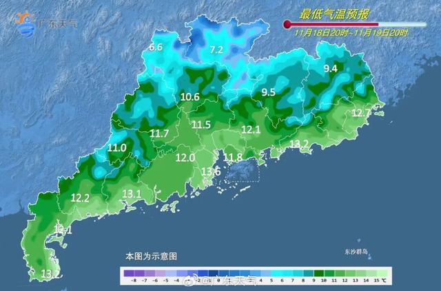 最低气温:粤北偏北市县6-9℃(粤北高海拔山区2-5℃),粤北其余市县和珠江三角洲北部市县9-11℃,南部沿海市县14-17℃,其余市县11-14℃。