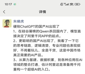 昨日千问app公测上线后,著名投资人金沙江创投朱啸虎在朋友圈中表示,“硬刚ChatGPT的国产AI出现了。1、在硅谷屠榜的Qwen杀回国内了,模型直接决定了阿里千问APP的起点;2、更聪明的国产AI出现了,我看了一下它的思考链路,逻辑清楚,专业问题也表现挺好,不闹着玩儿,全是干货,这是中国市场真正需要的AI产品。3、从算力基建、数据积累,到各种应用在AI领域的整合打通,估计阿里这是准备用千问重构一个超级AI的入口。”