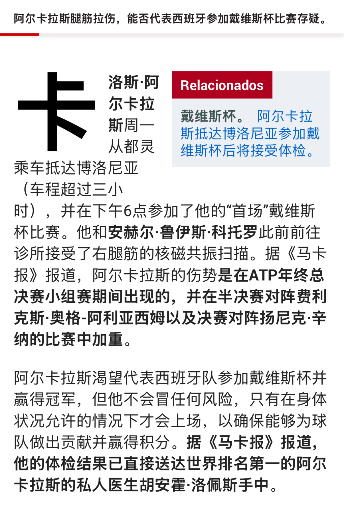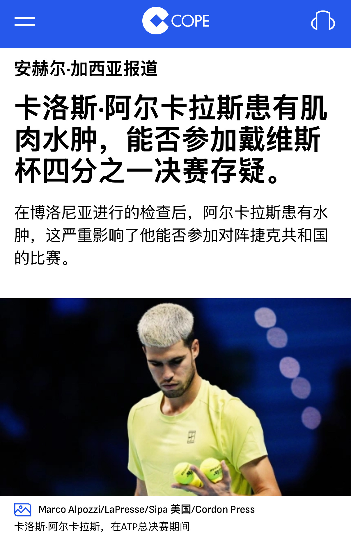 西媒报道,阿尔卡拉斯因肌肉水肿,可能缺席本周西班牙与捷克之间戴维斯杯四分之一决赛。本周一接受核磁共振检查后,他的右腿半腱肌被诊断出存在肌肉水肿,若过度发力,将面临肌肉撕裂风险。据阿卡的团队透露,目前他可能仅出战单打比赛(原本还考虑让他与格拉诺勒斯搭档双打)。周二他将不会参加训练,在酒店接受治疗。周三再进行一次检查以评估伤情,届时将决定他是否能够参加比赛。