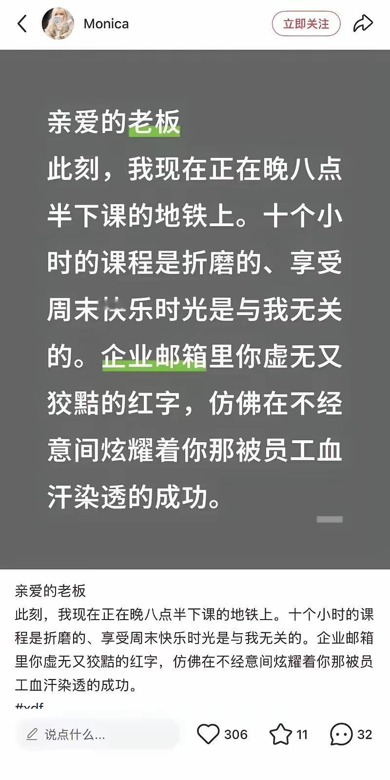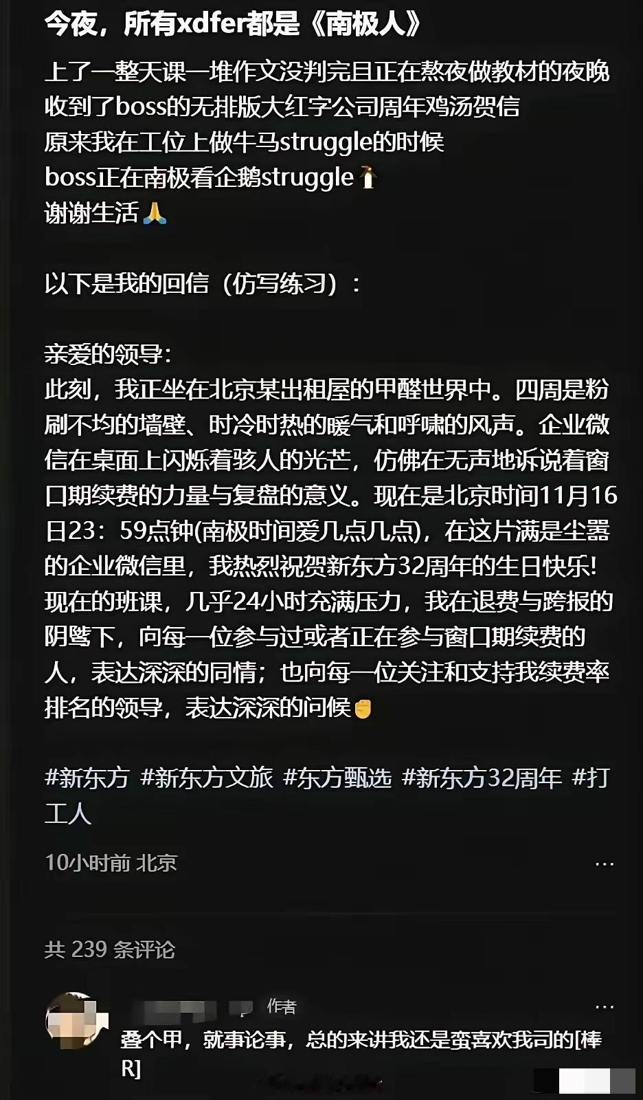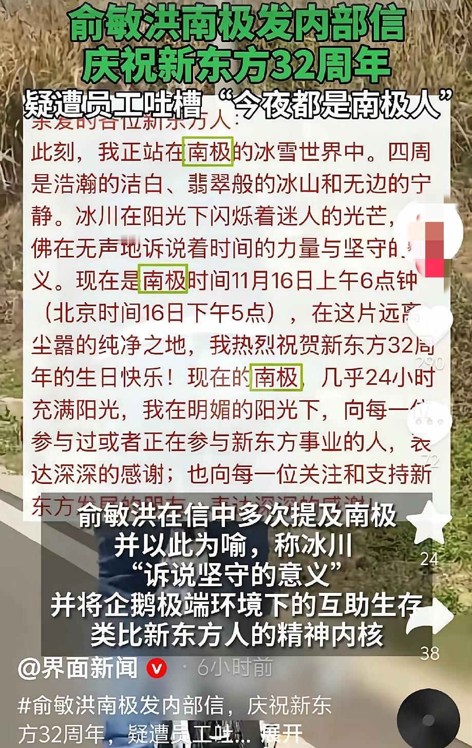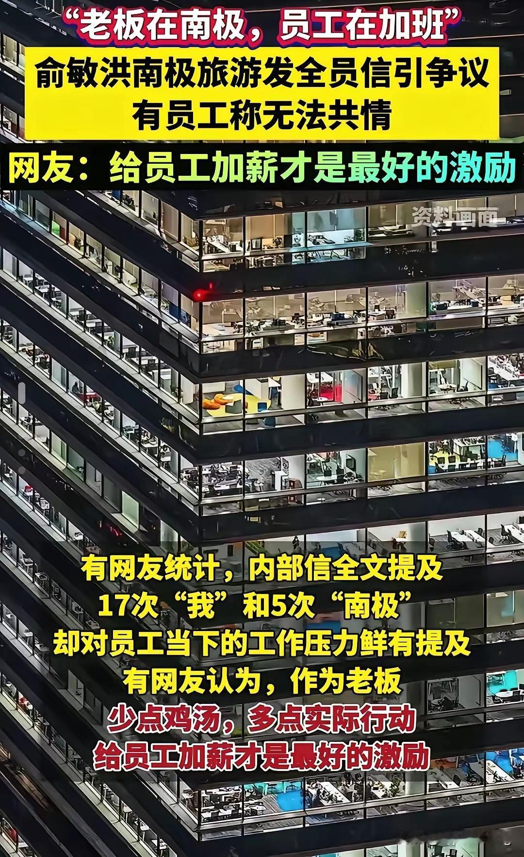 俞老板又挨骂了!在南极享受着24小时的阳光,刺痛了打工的牛马。“吃肉别吧唧嘴”、“你在南极看极光,我们在灯光下苦熬”。给点加班费才是最实惠的。 俞老板真是个老文青。无论何时,情到深处,不忘感慨一番给员工发点鸡汤类的小作文。 记得是现在00后不吃这一套了。你的创业光环激励不了他们,反倒更贴近现实,别画饼,有本事就来点实惠的。 老俞不得不又发道歉信。这一番操作猛如虎,凡尔赛没成,弄了一身泥。 老俞的幸福,牛马们无法共情。 看来老俞真是血雨腥风的体质,上一秒优越感满满,下一秒牛马们就将其拽入冰冷的深渊。