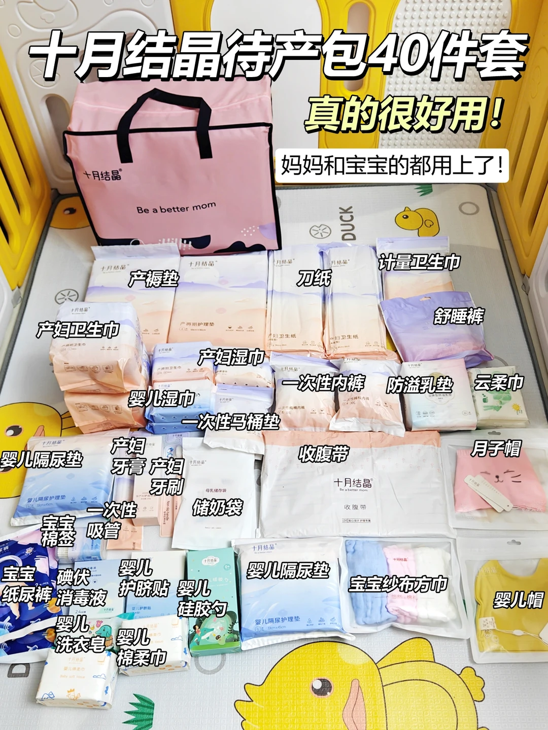 在我对比过的众多待产包里,十月结晶待产包40件套,科学合理,入院待产需要用的物品很齐全,数量拿捏得到位,产妇和宝宝必备的物品全部都在一个无纺布袋子里装好,整整齐齐。