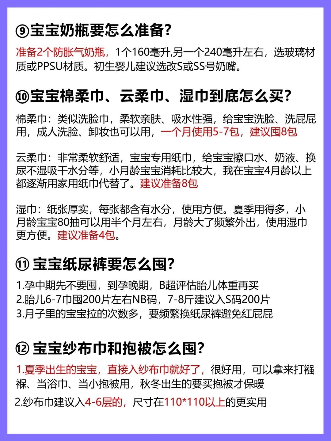 [二R]初生宝宝的物品怎么准备,里面包含了:奶瓶、棉柔巾、云柔巾、湿巾、宝宝纸尿裤、宝宝纱布巾、宝宝衣服、宝宝小方巾、宝宝睡袋、宝宝隔尿垫、宝宝口水巾