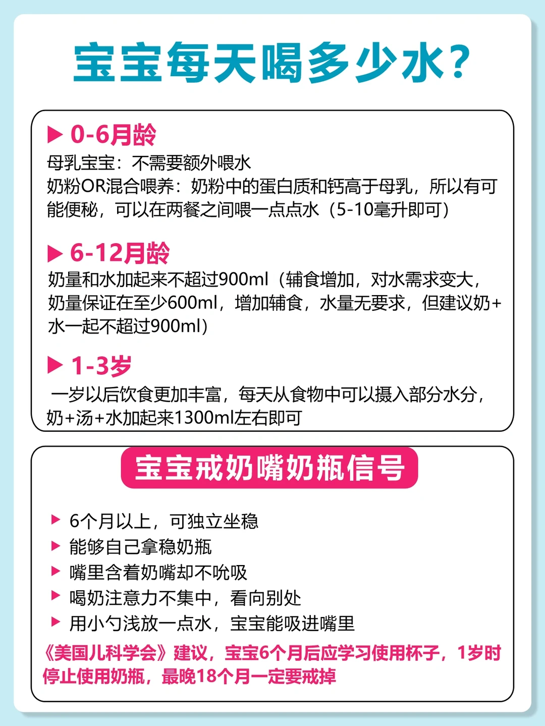 6-12月龄,虽然添加辅食,依然以奶为主,每天保证600毫升的奶量,加上水不超过900毫升就好(胃容量小,喝太多水可能会影响奶量)
