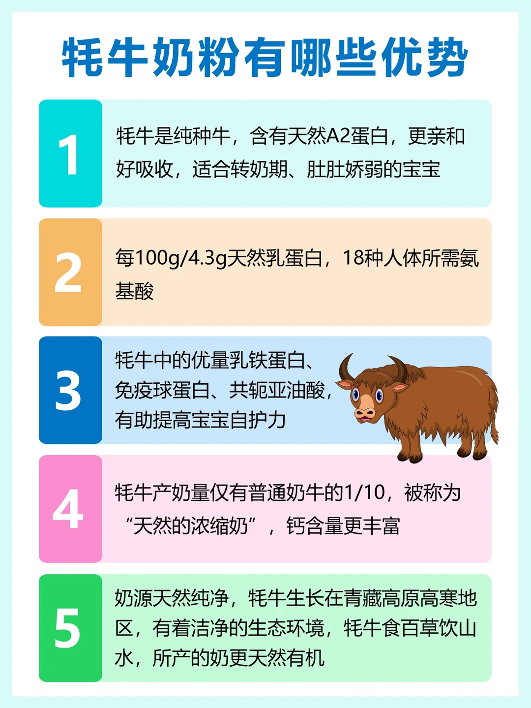 而且牦牛是纯种牛,含天然好吸收的A2-β酪蛋白,对肚肚娇弱的宝宝很友好~以及丰富的天然乳铁蛋白,帮助宝宝从内提高自护力~