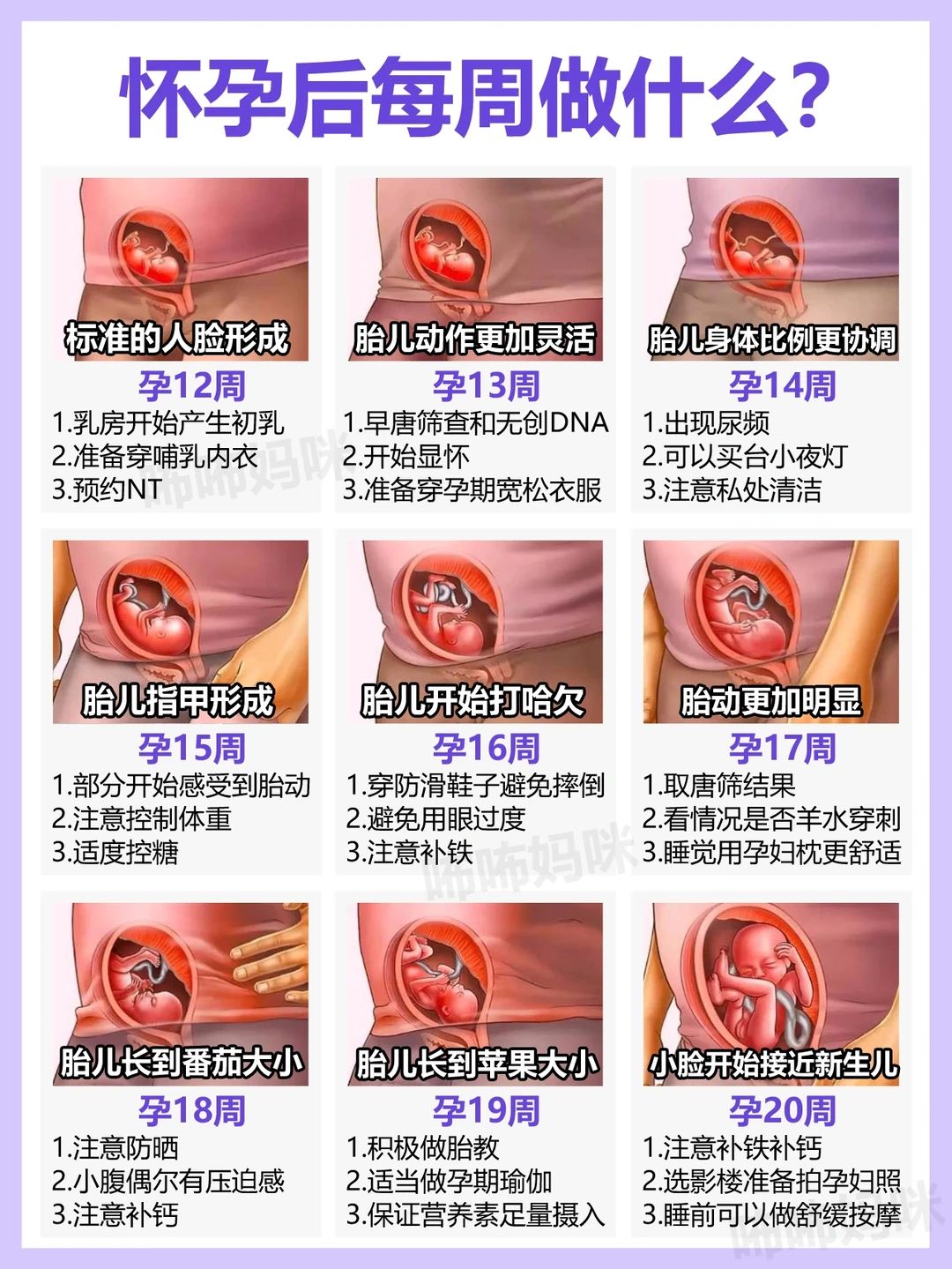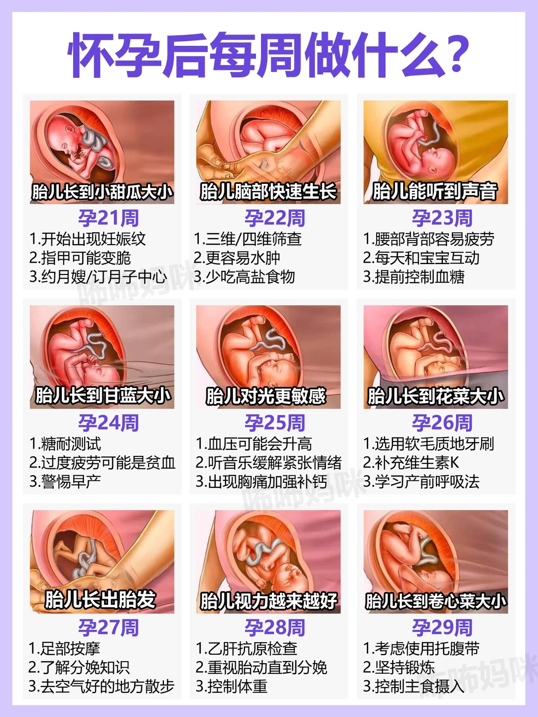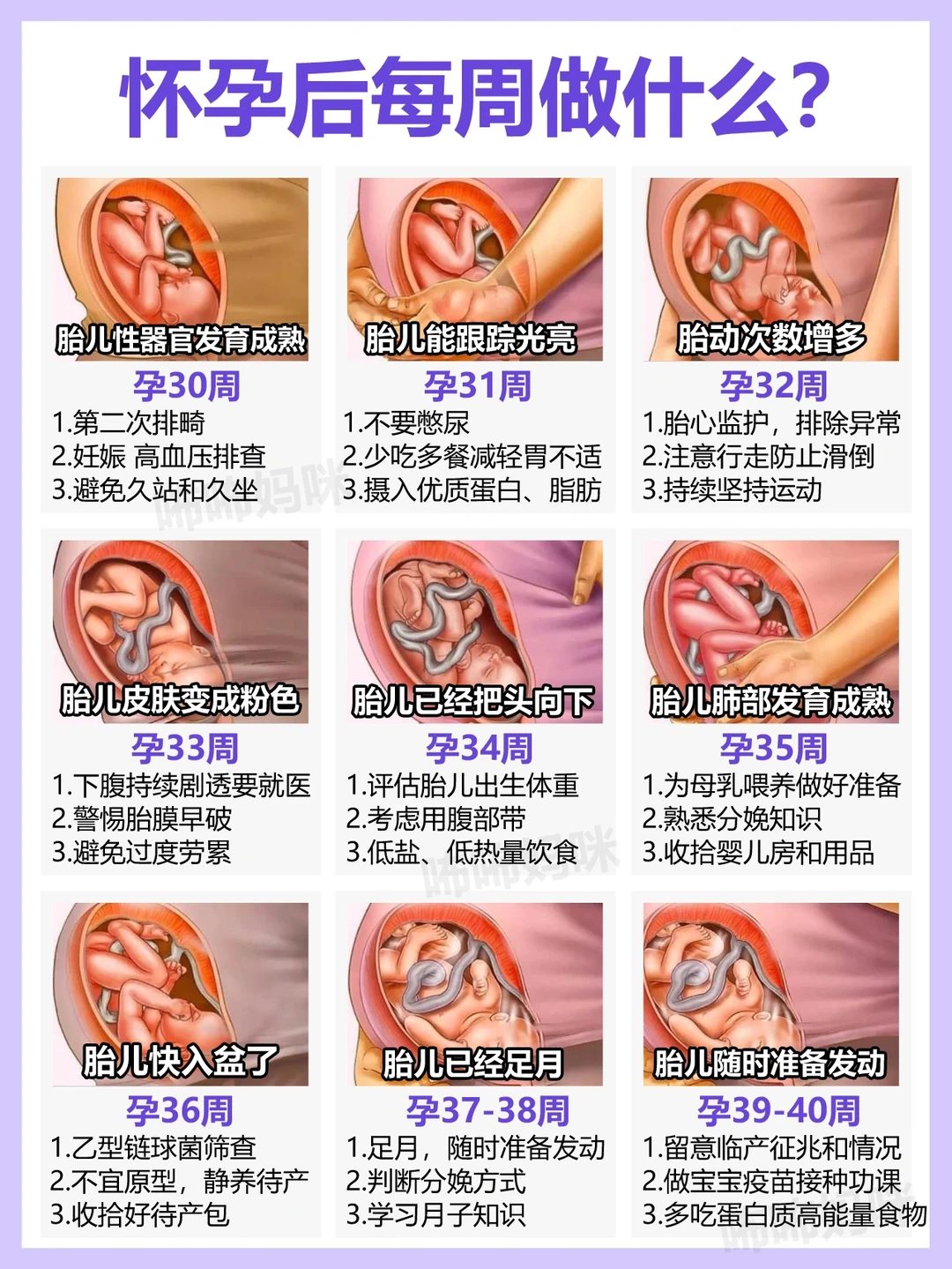 怀孕后,每周要做什么呢? 新手妈妈是不是开始迷茫,应该做哪些产检,应该怎么补充营养,应该如何护理? 👉今天把孕期每周需要做的事(产检、补营养、护理、注意事项)分解出来, 新手爸妈们打印照做!