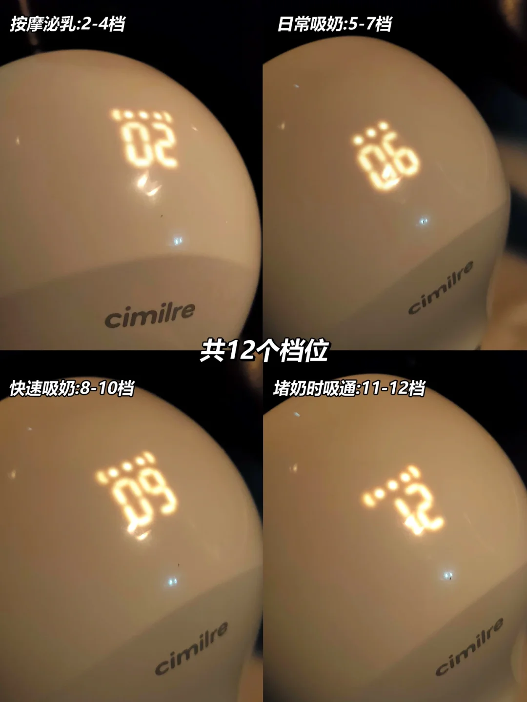 4.12个档位,吸力够够的,我一般拿2-4档泌乳,6-8档日常吸乳、9-10档在赶时间的时候快速吸乳,11-12档是比较长时间没吸奶导致有点堵奶的时候用,通乳效果超赞!(但是都要按摩低挡位开始哦~)