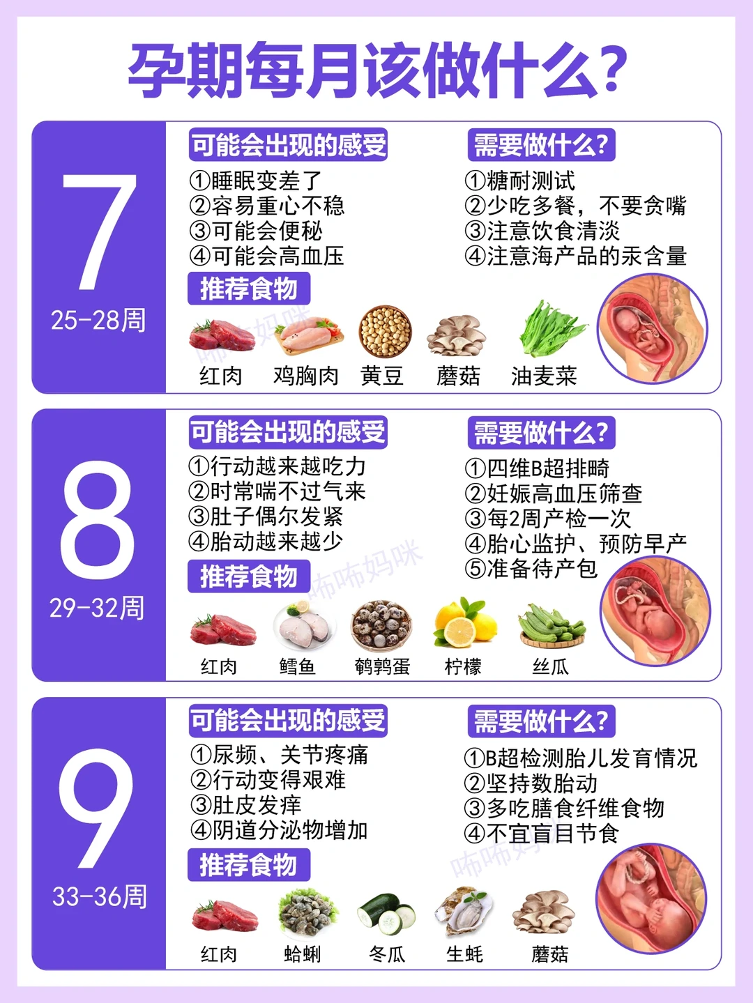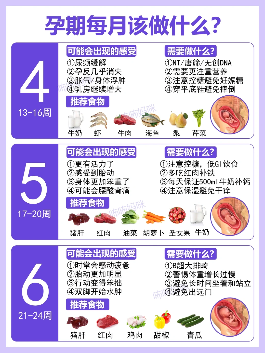1-3月孕前期会经历恶心、孕吐等妊娠反应,这阶段要注意补充叶酸,把食盐换成碘盐,同时有任何不舒服都不要自己私自用💊。饮食方面不要吃太多,但要注意搭配合理,重质不重量