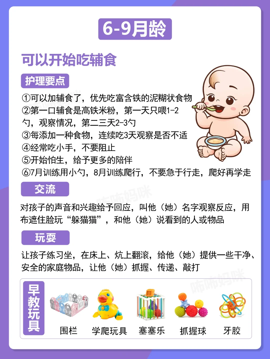 6月龄可以开始吃辅食,7月龄训练用小勺,8月训练爬行,不要急于行走,先爬好再学走