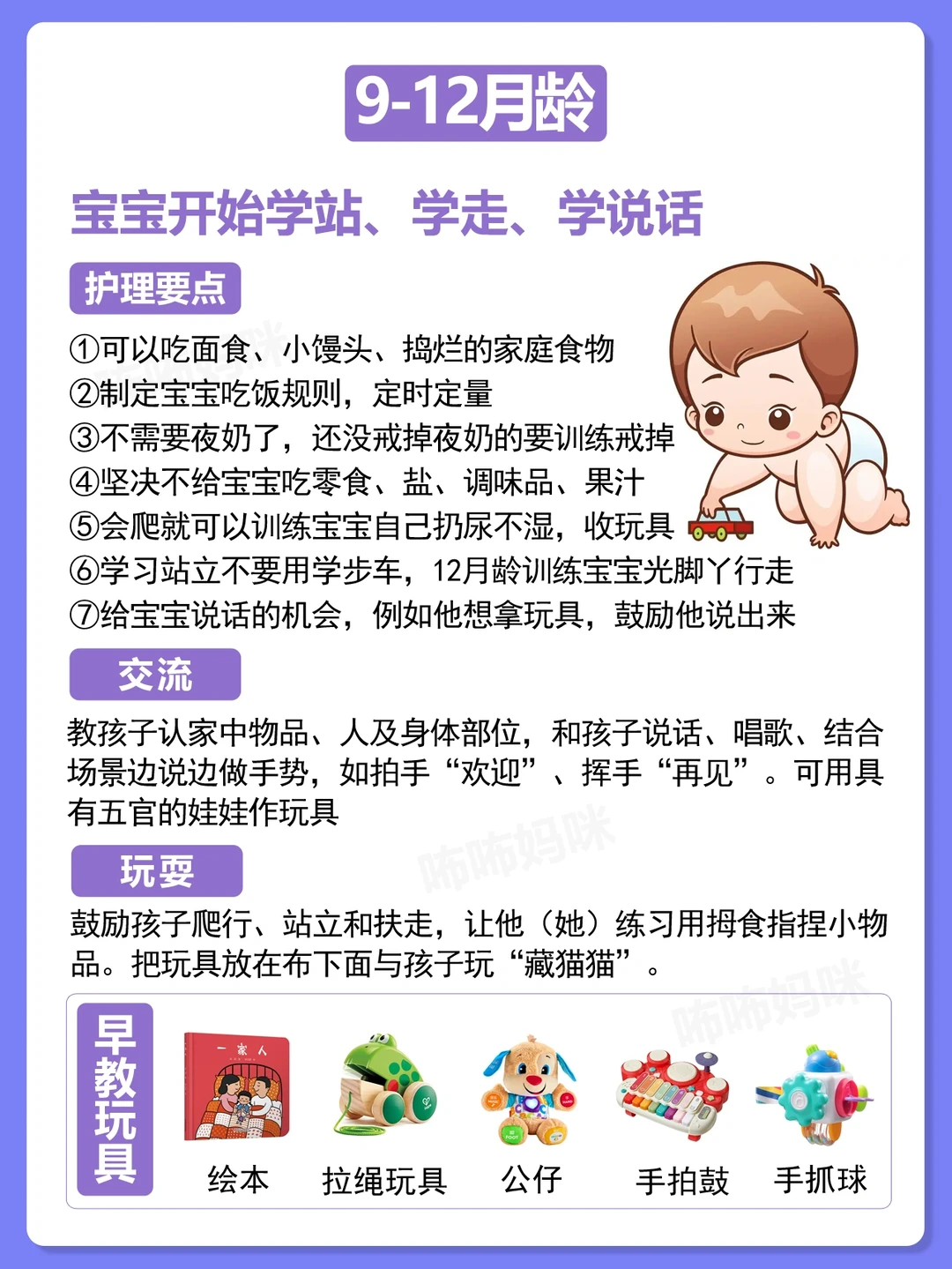 这个时期可以和宝宝玩捉迷藏,和宝宝说/描述看到的人/物品,可以给宝宝搭建围栏、准备好学爬玩具,及一些可敲打的玩具