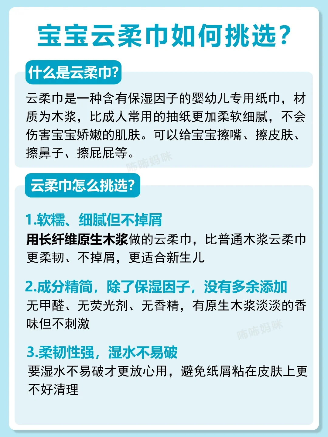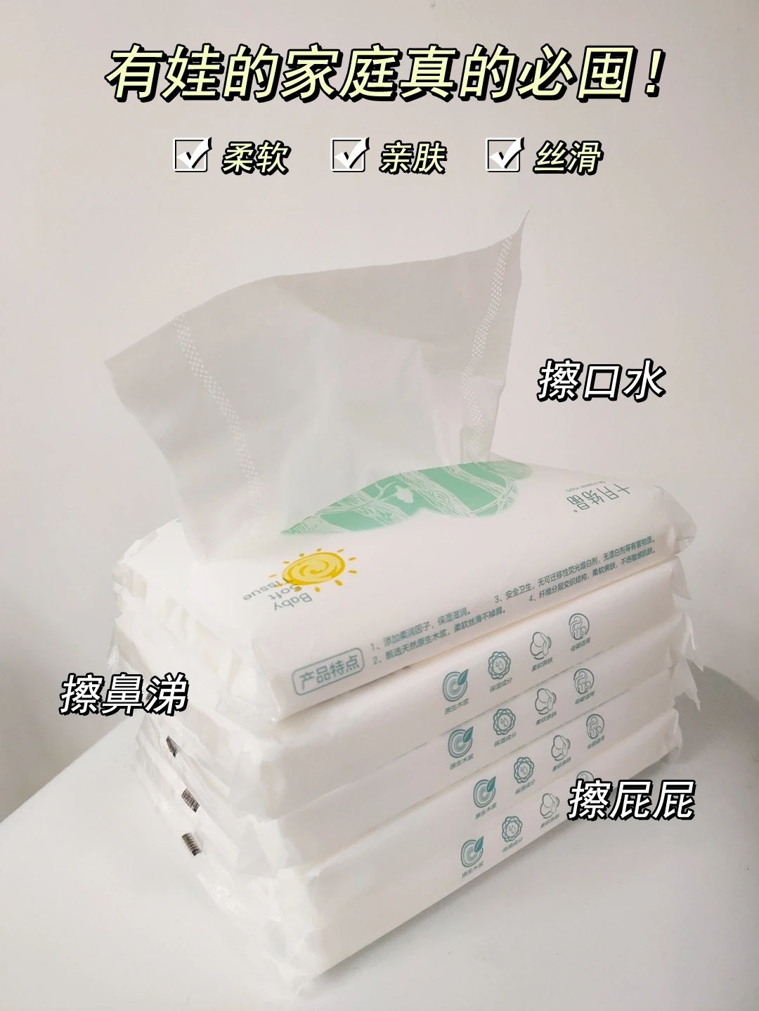 非常柔软舒适的纸巾,用途跟大人用的纸巾一样,擦嘴、擦脸,一般市面上的云柔巾都加了保湿因子,因此非常绵糯,不伤宝宝皮肤
