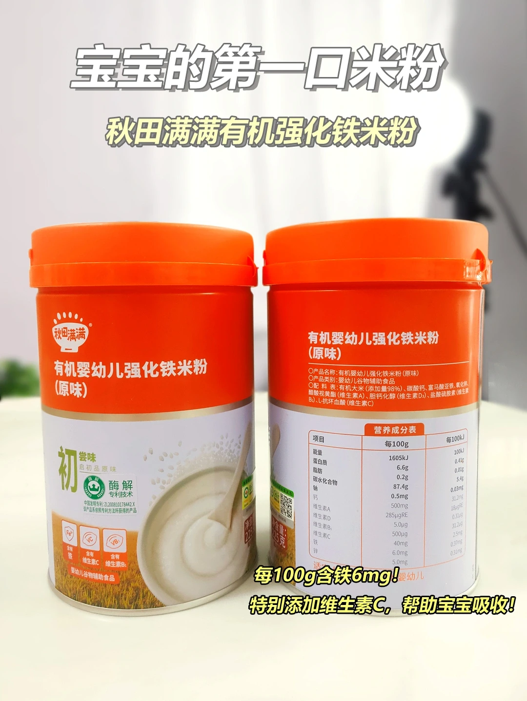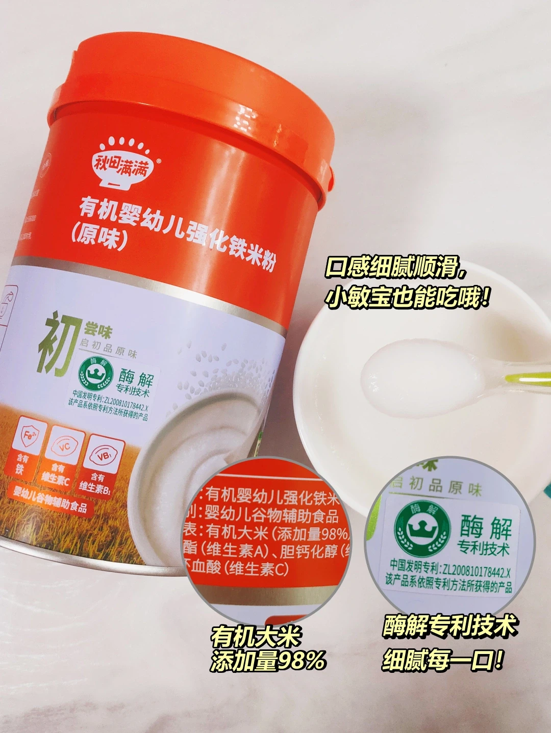 🌈秋田满满有机强化铁米粉,在我研究的米粉品牌里,铁含量很高,有6mg/100g,有机大米的添加量98%,矿物质铁的化合物来源是富马酸亚铁,适合敏宝宝,特添加维生素C帮助宝宝吸收铁