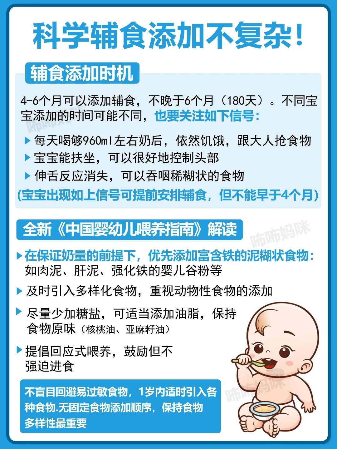 4-6个月可以添加辅食,不晚于6个月(满180天),早产宝宝按照纠正月龄算。