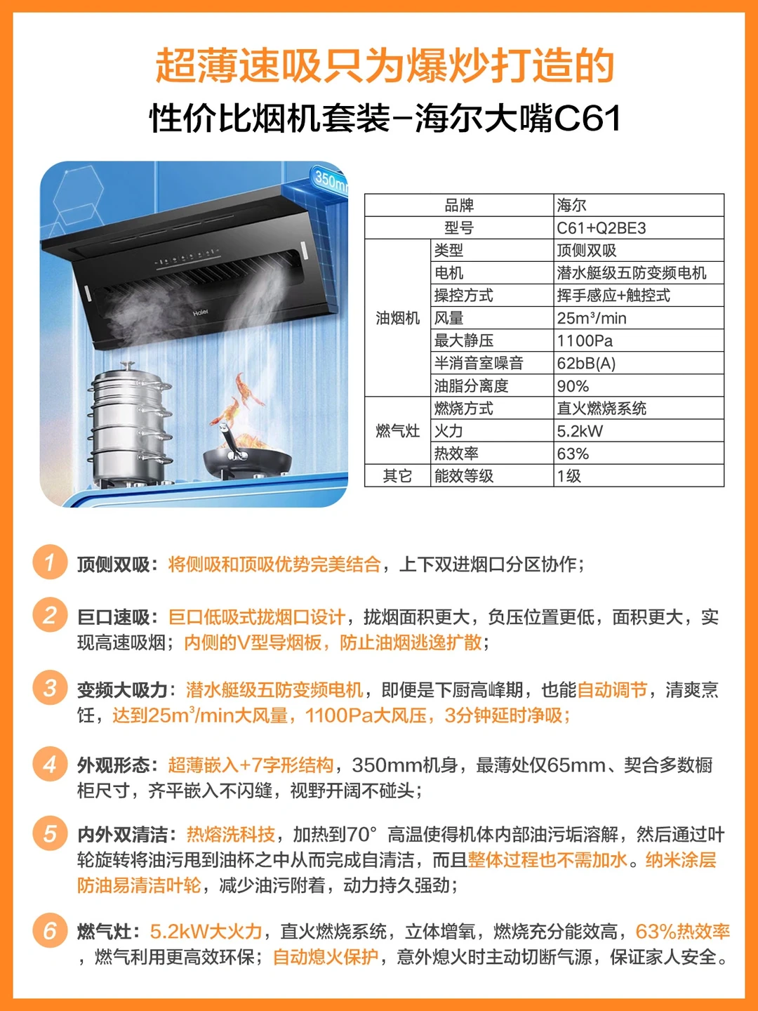 结合以上各种因素考虑,新房装修我最终选购了【海尔大嘴C61】这款吸烟机套装,用起来后才知道选对了,终于可以享受做饭的美好时光。