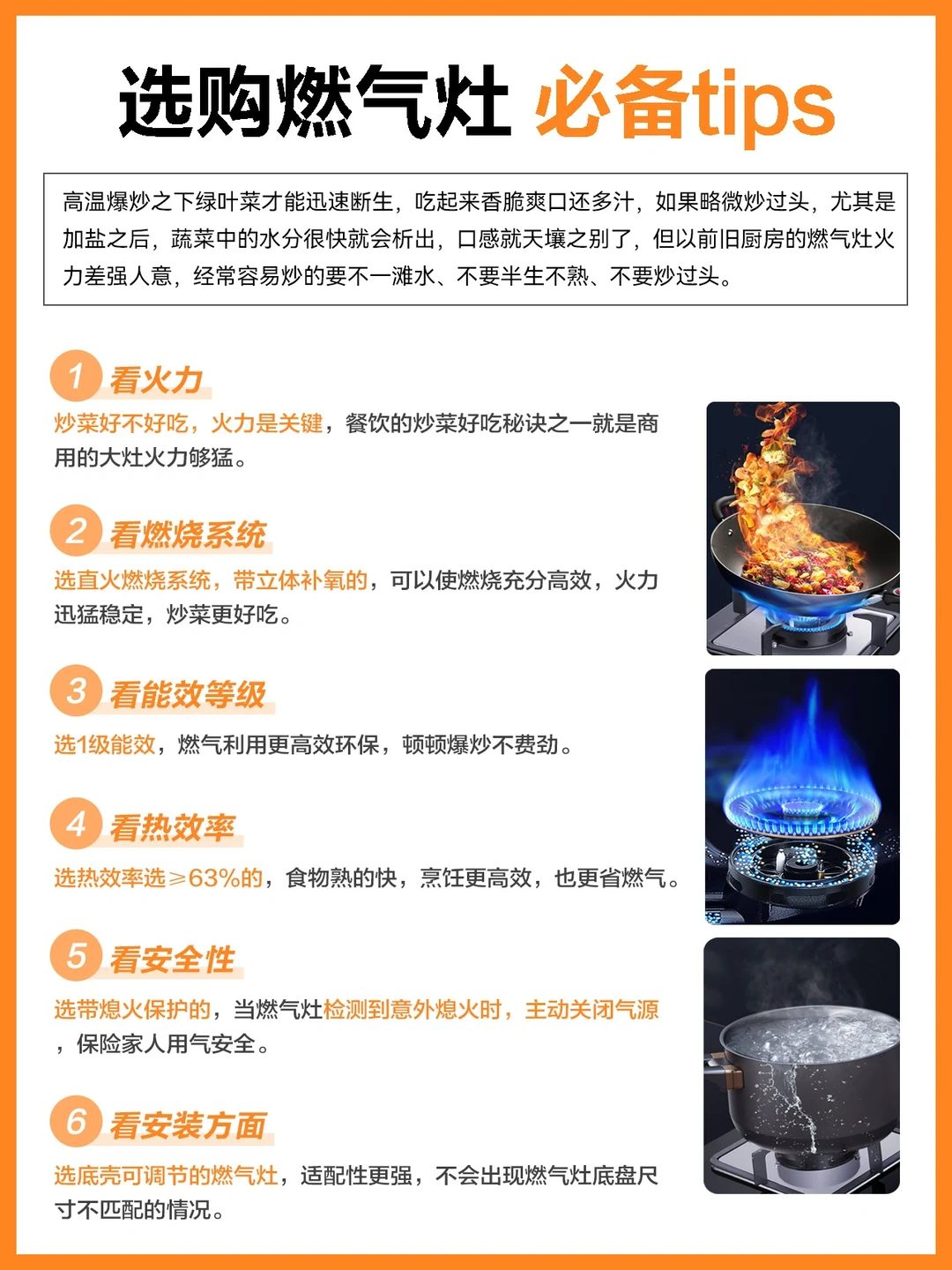喜欢清淡的朋友们可选4.5kW火力以上,喜欢爆炒的朋友们就要搭配5kW以上大火力,火力大炒菜才更好吃