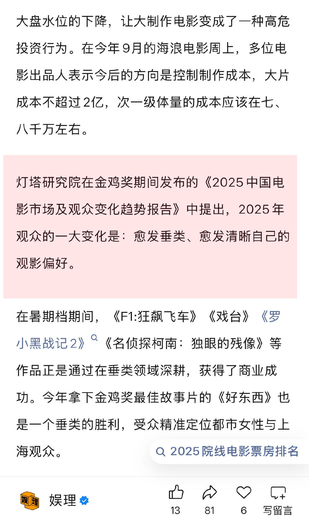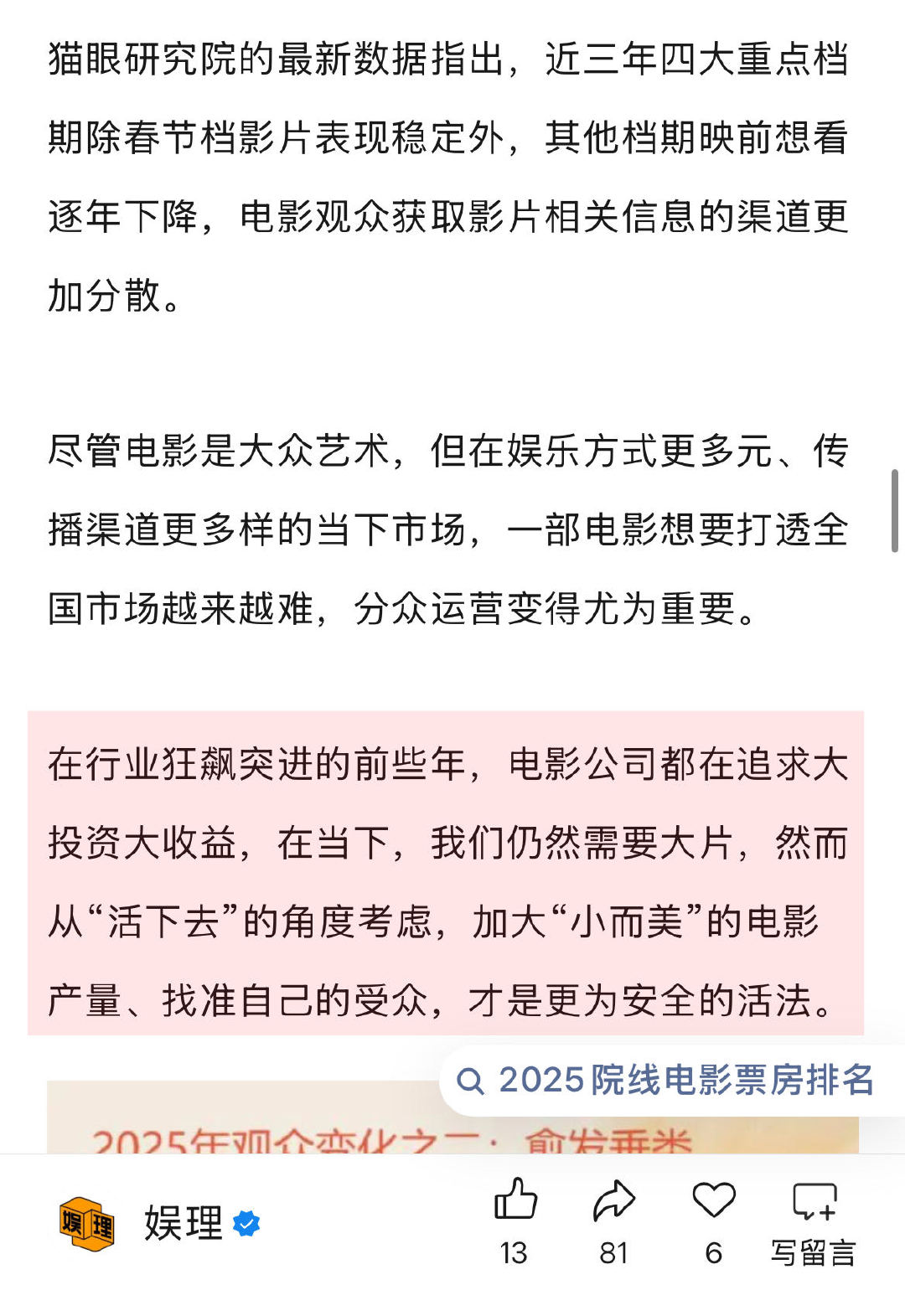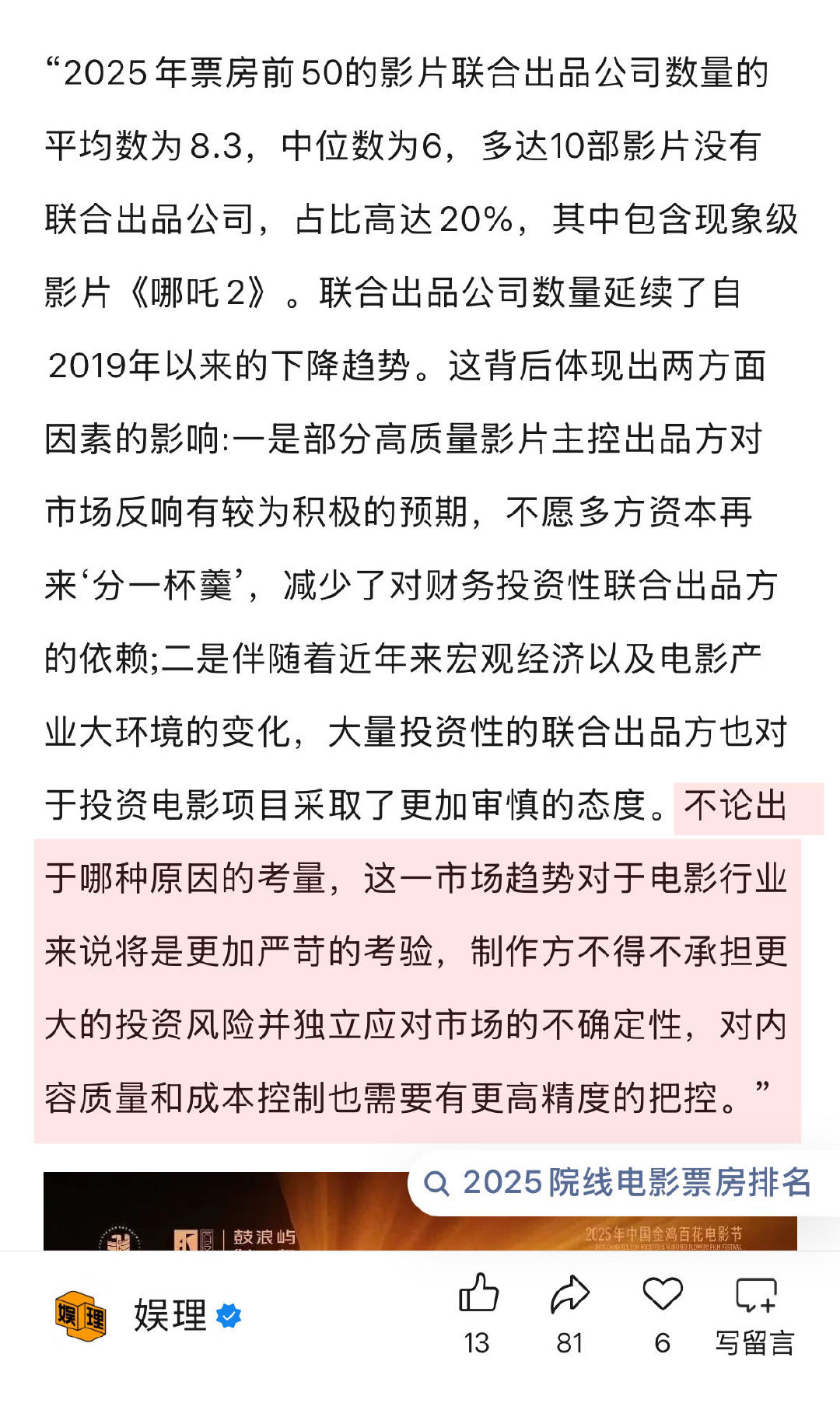 2025年电影市场的显著现象是多部高投资大片没有获得预期票房,这直接影响了背后出品方的现金流,一些曾经在市场活跃的电影公司都大大降低了产量。金鸡鼓浪屿论坛上发布的《2025中国电影投融资报告》对2025年票房前50名的影片出品方与联合出品方数量进行统计,发现这一年单部影片的出品方与联合出品方数量皆有所下降…↓