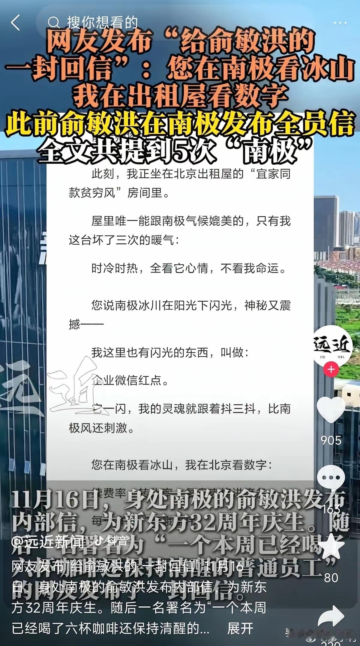 老俞啊老俞,真是聪明一世糊涂一时,你说你鼓励员工好好工作,直接说就行了,哪有那么多弯弯绕绕,说自己在南极看冰川企鹅,享受冰雪世界,希望公司的小伙伴坚守初心互相扶持,你说这不是纯纯地挑事儿吗,本来能互相扶持,被你这话都干懵了。老板在南极玩,他们打工人在公司工作,不知道的还以为是年底业绩做得好老板请员工们一起去南极玩呢。