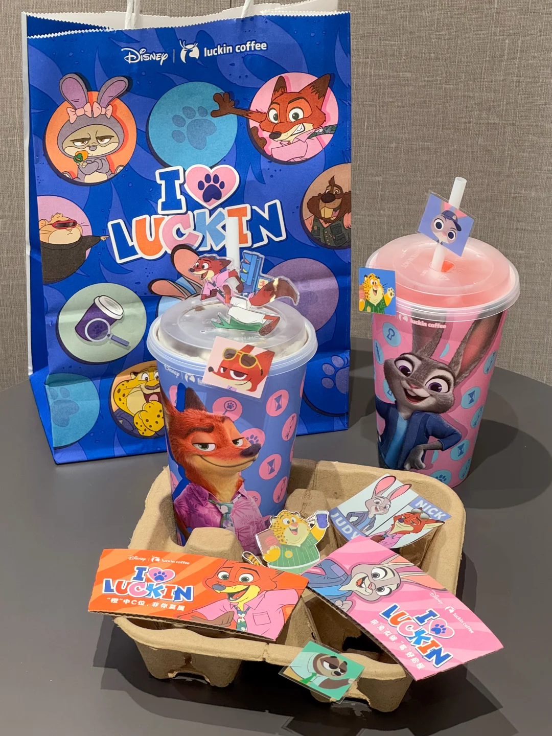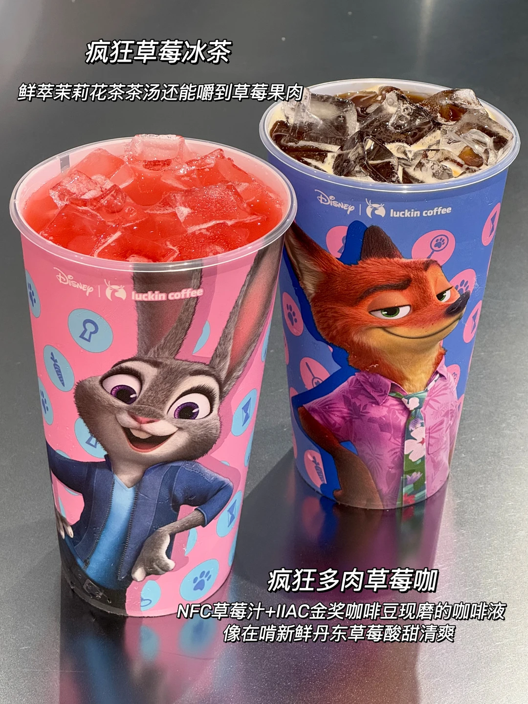 我不想吃上班的苦也不想吃生活的苦 拒绝吃苦从喝瑞幸疯狂多肉草莓咖开始! 感谢瑞幸让我0.01r🉐3张饮品⭕!!!知道双十一后的我钱包👛扁扁😭 终于等到我爱的草莓季🍓两款新品都好喝 🍓疯狂多肉草莓咖 NFC草莓汁🍓搭配用IIAC金奖咖啡豆现磨的咖啡液☕ 像在啃新鲜丹东草莓酸甜清爽 点了超大杯用的朱迪PP杯敲可爱~ 🍓疯狂草莓冰茶 颜值高的一杯好出片!鲜萃茉莉花茶茶汤🍵还能嚼到草莓果肉 草莓脑袋闭眼冲就对了! 还点了刚回归的太妃榛香拿铁😭和经典的生椰拿铁 每次点依旧还是这么好喝! 想get🦊🐰狐兔 PP 杯的,点生椰杨枝甘露超大杯、果蔬茶超大杯、果 C 美式超大杯也能获得哦!! 和疯狂动物城2联名的周边不要太可爱奥😭 贴纸、3款杯套、4款纸袋、3款金属徽章、4款亚克力徽章、2款毛绒相框全部都想要!!