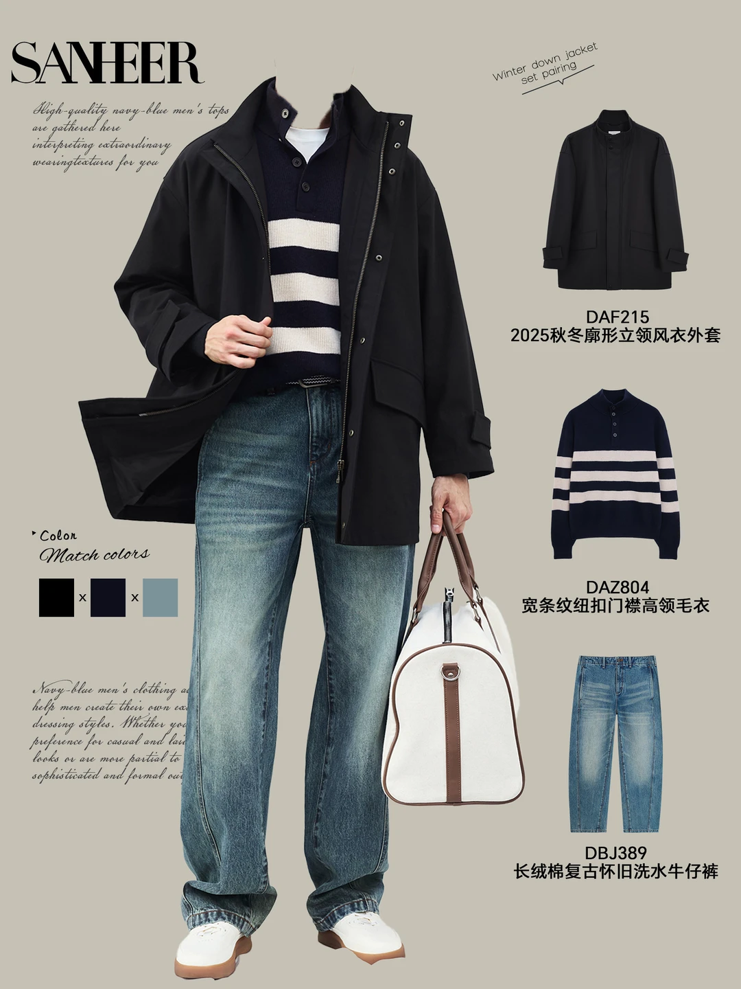 军绿色派克 + 高领打底 + 工装裤 + 登山靴黑色派克 + 条纹毛衣 + 直筒裤 + 板鞋