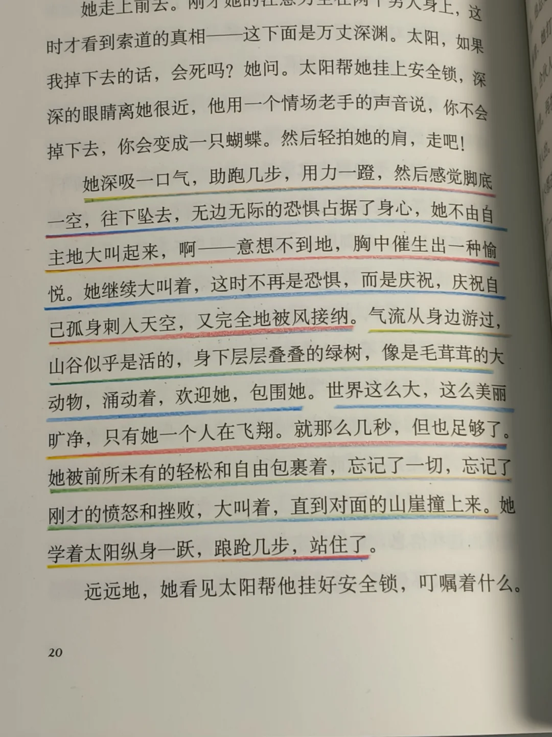 “她深吸一口气,助跑几步,用力一蹬,然后感觉脚底一空,往下坠去……不再是恐惧,而是庆祝,庆祝自己孤身刺入天空,又完'全被风接纳。”
