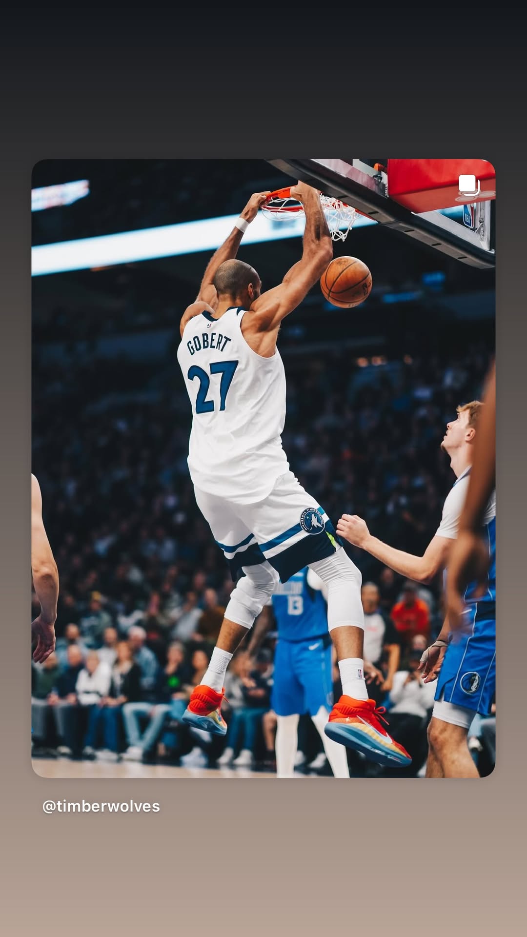 虎扑11月18日讯森林狼球员鲁迪-戈贝尔更新个人社媒,晒出今日赛场双手扣篮照片。