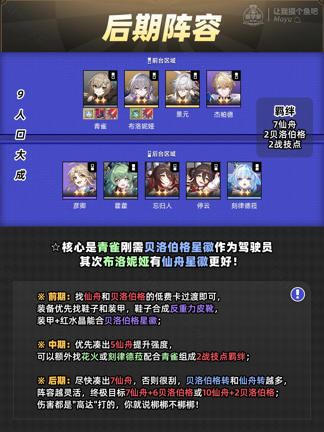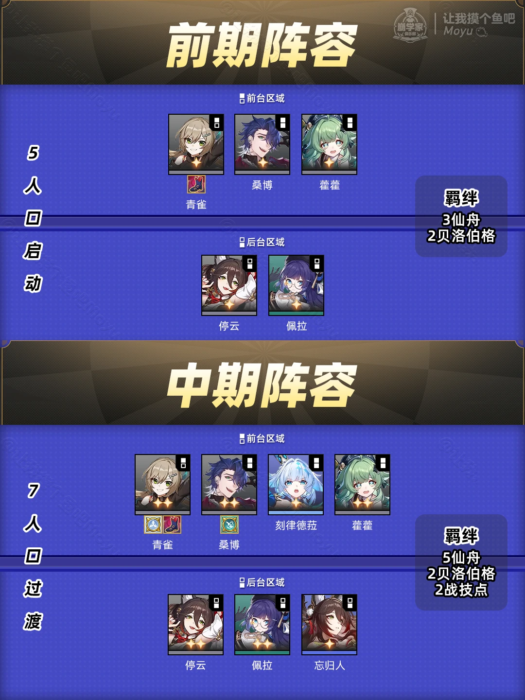 【中期】优先凑出5仙舟提升强度,可以额外找花火或刻律德菈配合青雀组成2战技点羁绊;