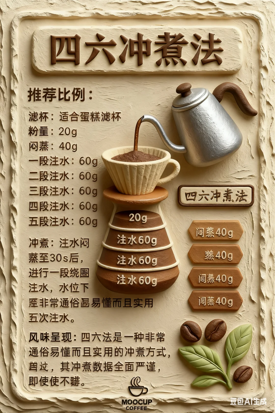 四六冲煮法用蛋糕滤杯,粉量 20g,闷蒸 40g 水,30 秒后分五次各注 60g 水。步骤清晰,数据严谨,新手跟着定量加水,不容易出错。