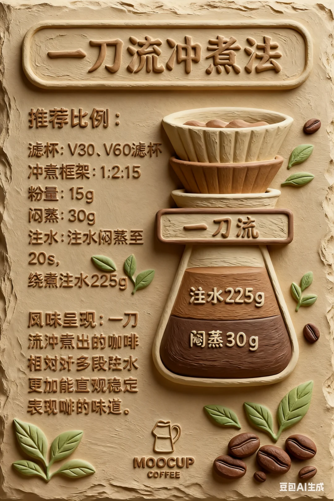 一刀流滤杯选 V30 或 V60,粉量 15g,先加 30g 水闷蒸 20 秒,接着绕圈注 225g 水。操作直接,咖啡本味表现稳定,适合想快速喝到咖啡基础风味的人。