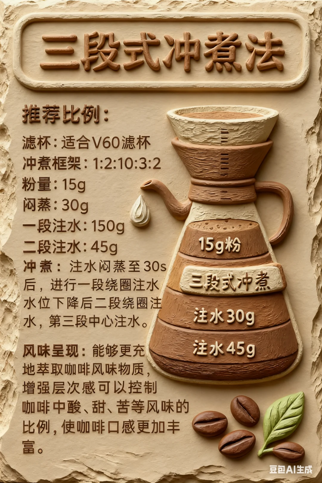 三段式适配 V60 滤杯,粉量 15g,闷蒸 30g 水,30 秒后绕圈注 150g,水位下降后再绕圈注 45g,最后中心注水收尾。能控制咖啡里酸、甜、苦的比例,冲出来的风味层次更丰富。