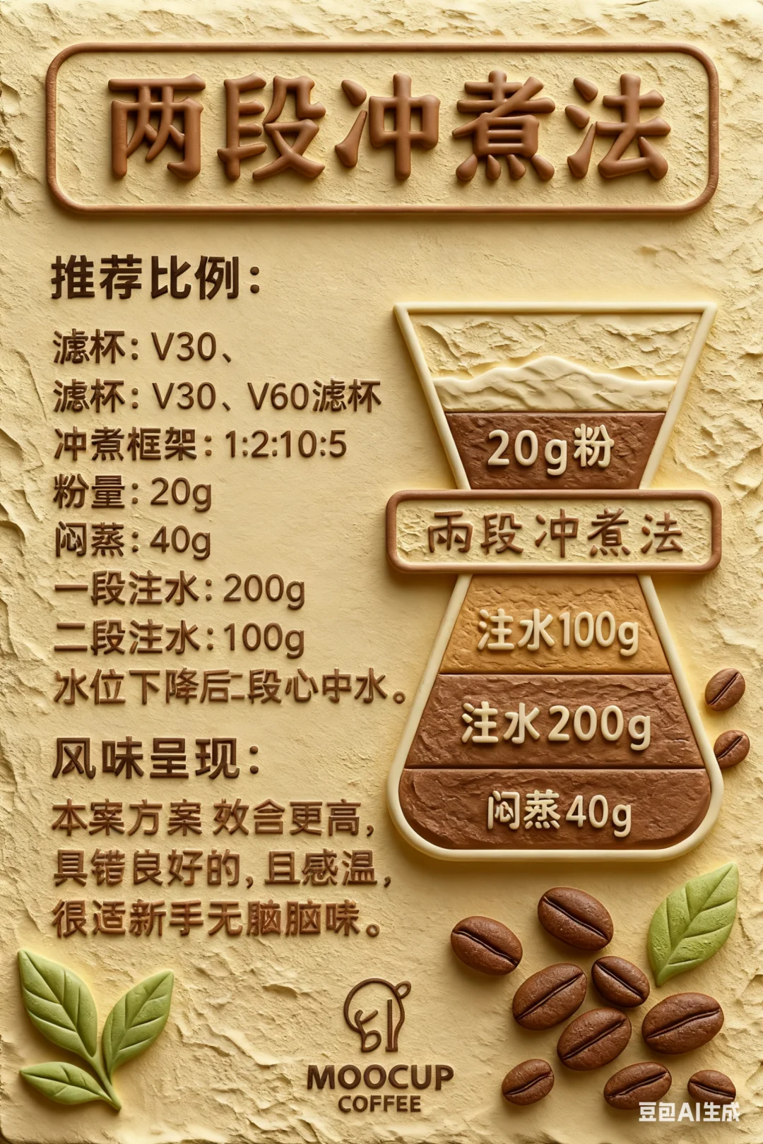 两段式滤杯用 V30 或 V60,粉量 20g,闷蒸 40g 水,先注 200g 水,等水位下降后补 100g。效率高,风味偏温和,新手不用纠结细节,跟着水量加就行。