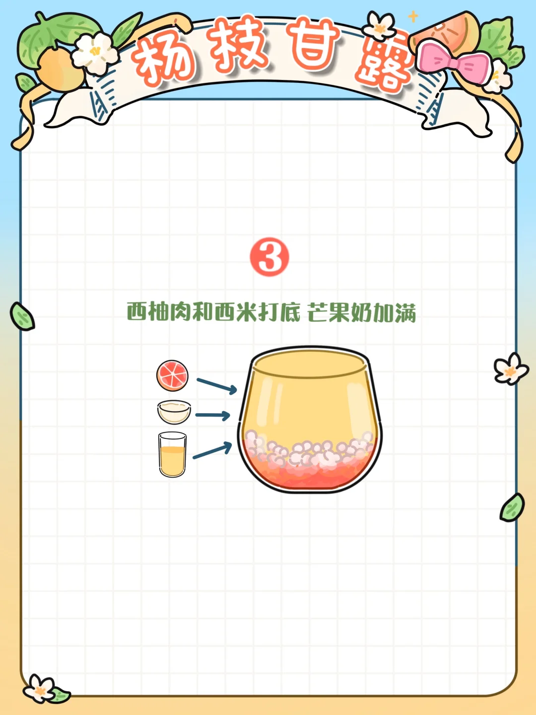 3️⃣西柚果肉和西米杯中打底,芒果奶🥭倒满