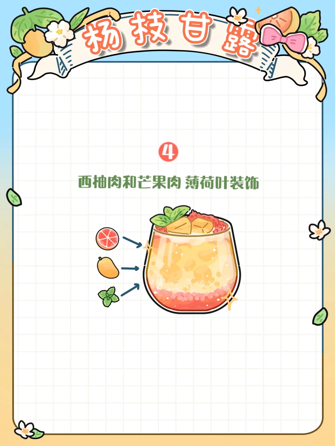 4️⃣加入一点芒果肉和西柚肉,薄荷叶🍃装饰一下