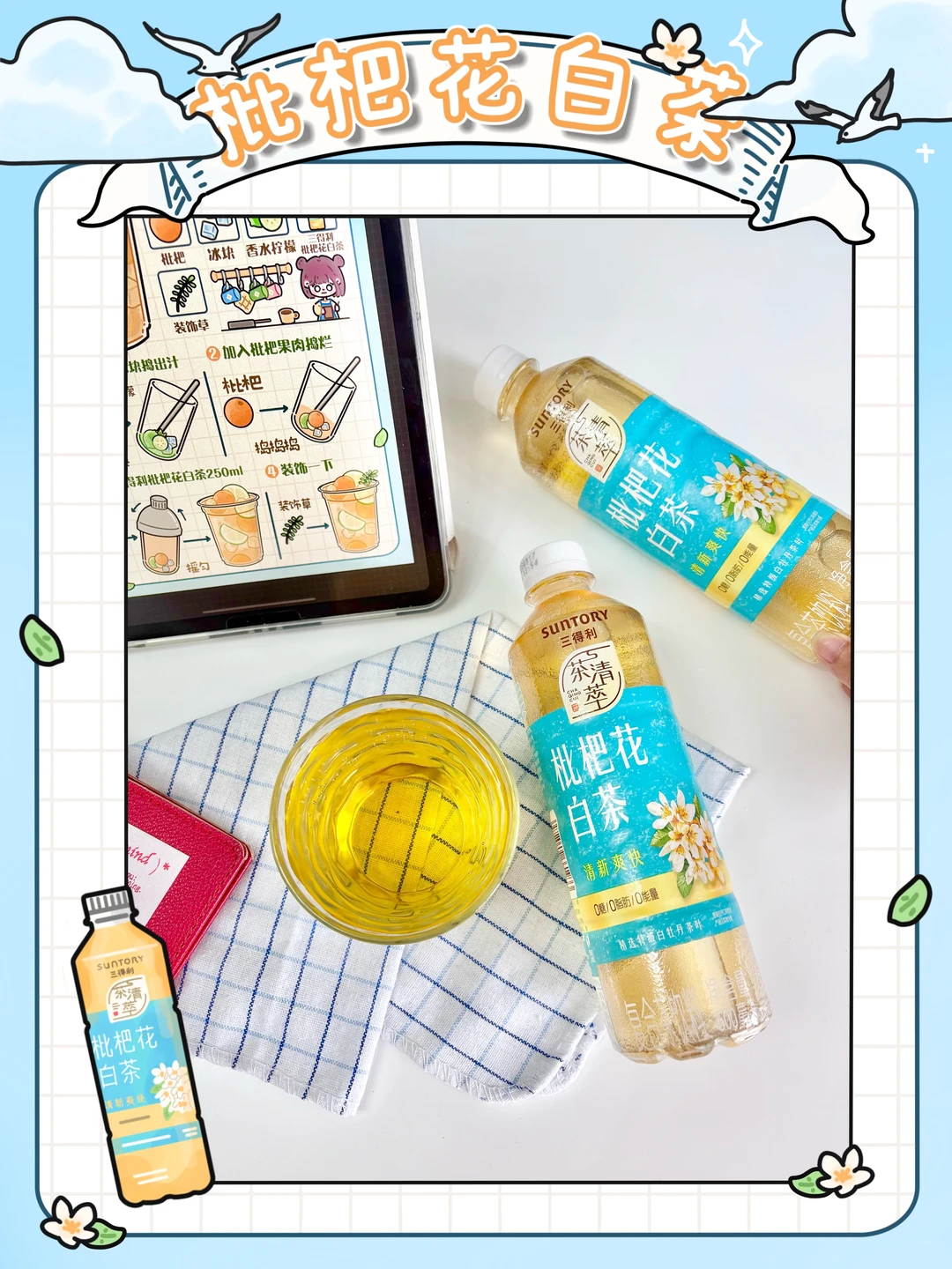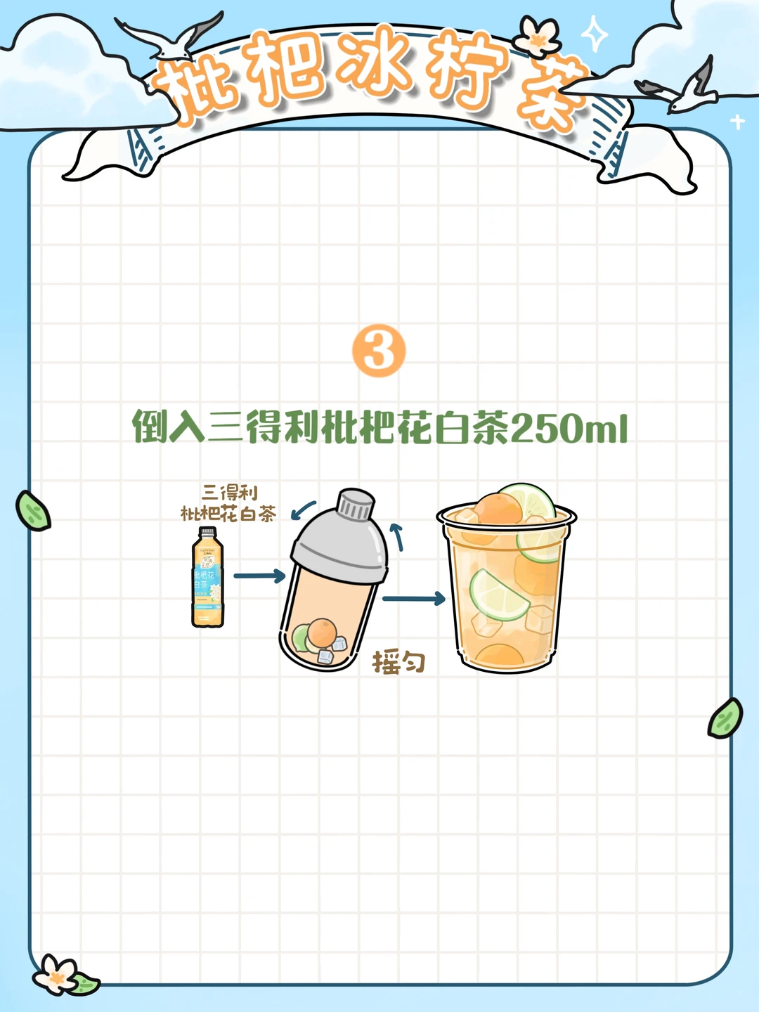 3️⃣加入三得利枇杷花白茶250ml摇晃均匀