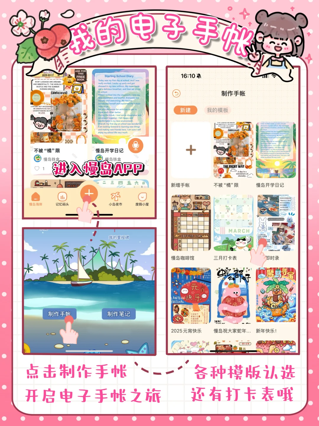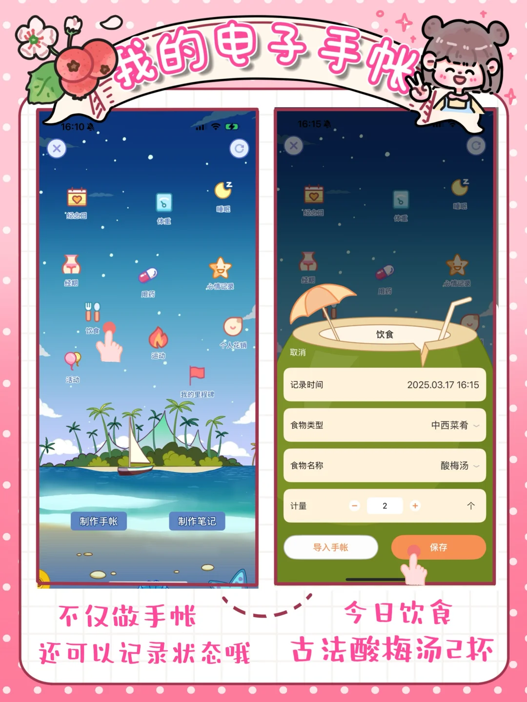 ⚠️慢岛不仅可以制作电子手帐,记录📝生活 美食 旅行日常等,还可以记录个人状态哦~点击经期 饮食 心情 睡眠💤等都可以随时随地记录✍️走到哪记到哪,真是我的生活好搭子👍