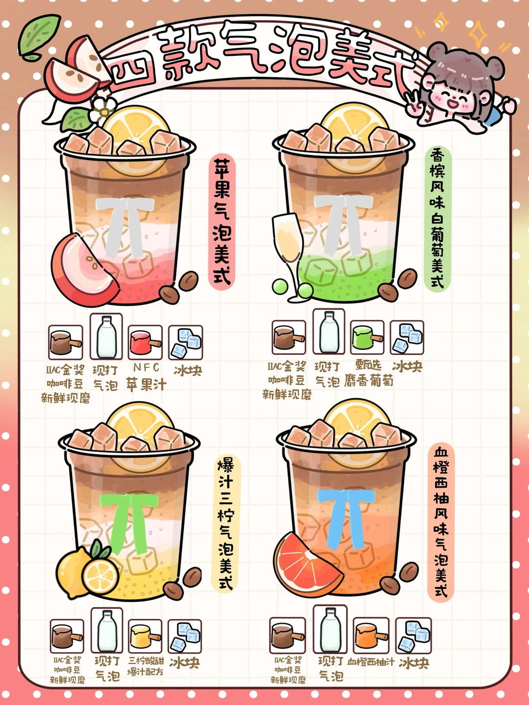 Hi!这里是小羊柚柚~ 今日份超清爽气泡美式☕来喽~一共有四杯 每杯都超惊艳谁懂‼️入口是清甜的果味🍋 然后是浓郁丝滑的咖啡香弥漫口腔😋再加上跳跃的气泡 本气泡美式脑袋真的爱疯💖 - 先来夸一夸新品🍾香槟风味白葡萄气泡🫧美式 水晶葡萄一样的分层增添了一抹清爽感🧊 用的实打实的进口麝香葡萄➕白葡萄 微甜中带着咖啡的香味,喝着真的很解暑 - 除了新品,其他的经典款也很惊艳 本柚子还复刻了一下肯悦咖啡☕的这四款超好喝的果味气泡美式🫧 - 1️⃣🍇香槟风味白葡萄气泡🫧美式 2️⃣🍎苹果气泡🫧美式 3️⃣🍋爆汁三柠气泡🫧美式 4️⃣🍊血橙西柚风味气泡🫧美式 - 🌟小tips 越喝越想说肯悦咖啡真的会搭配啊‼️把各种果味的酸酸甜甜➕丝滑浓郁的美式咖啡☕结合起来🤤真是夏日无敌快乐水🎉本柚子每天就是抱着吨吨吨 - 感谢喜欢💕我们下期见喽~ 欢迎👏点菜