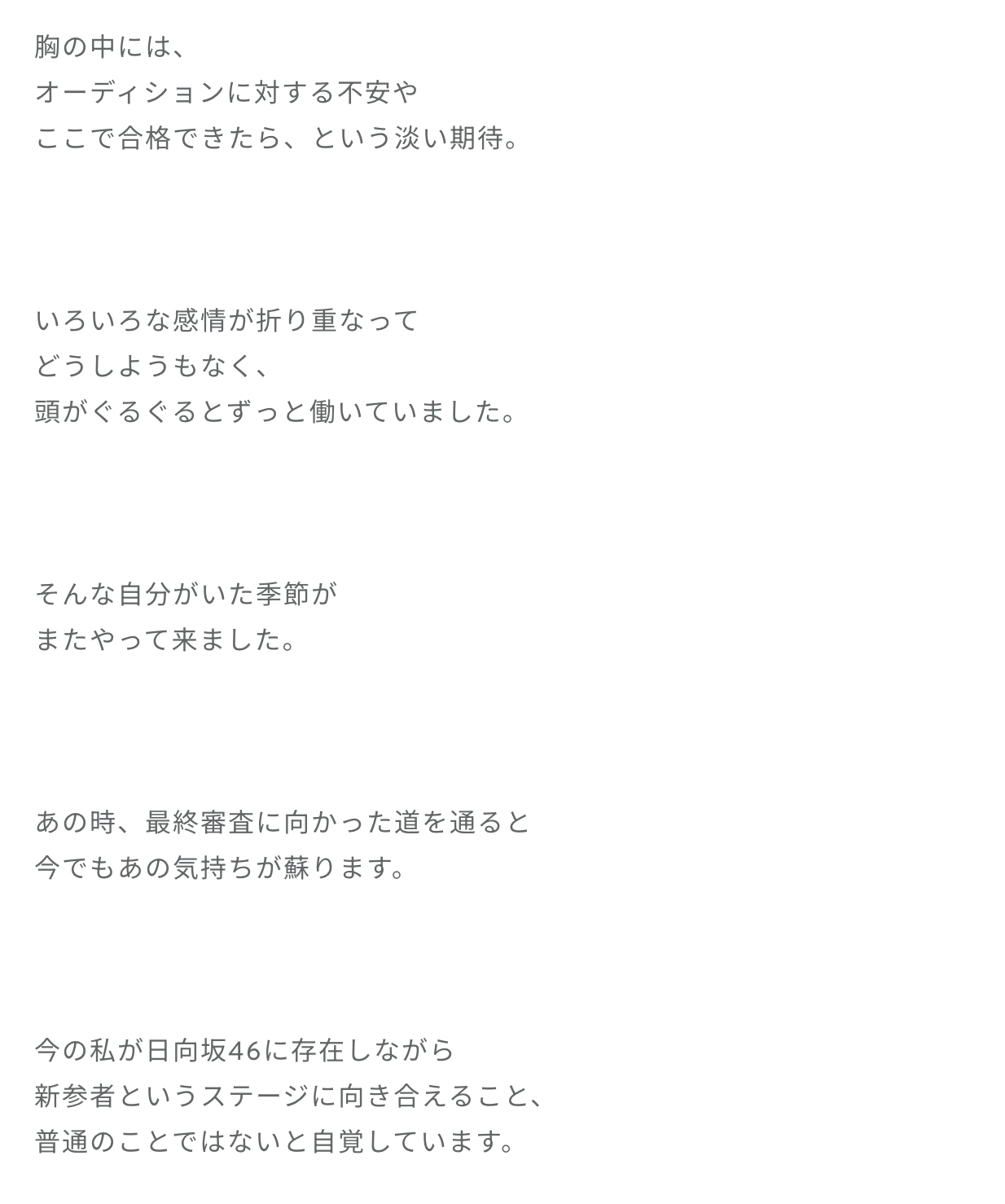 佐藤優羽「新参者公演において、私はすごく陽菜さんに助けられたと、そう実感する場面が多々あります。陽菜さんから、「ゆうちゃんらしくていいんだよ」と言っていただけたこと、本当に嬉しかったです。陽菜さんに精一杯の感謝をお伝えできるようなパフォーマンスになるよう、気持ちを込めてステージに立たせていただきます。よろしくお願いいたします( .ˬ.)"」
