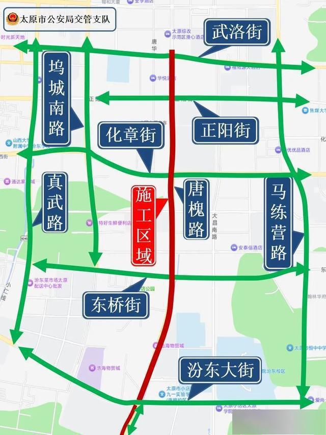 为确保施工期间道路交通安全及货运通道畅通,根据《中华人民共和国道路交通安全法》的有关规定,施工期间,唐槐路武洛街至汾东大街实施全封闭管理措施,禁止车辆通行,车辆可绕行坞城南路、大昌路等路段;唐槐路汾东大街以南至工程终点(太榆退水渠)将采取半幅封闭施工、半幅南北双向通行措施,车辆可绕行汾东大街、西贾北街、马练营路等路段。