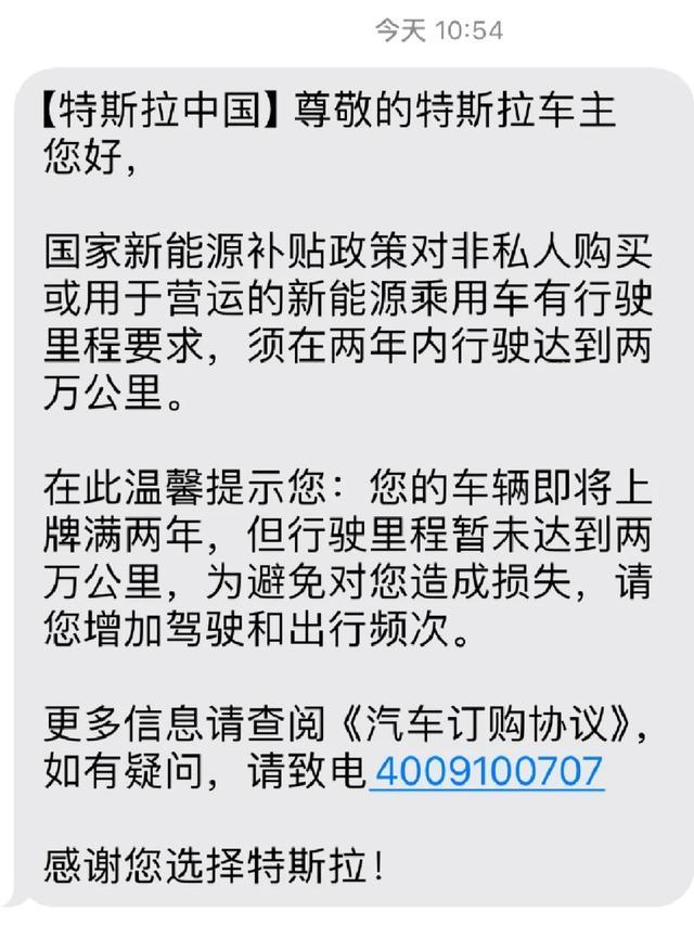 另有企业员工称,其曾收到特斯拉短信提示称:“您的车辆即将上牌满两年,但行驶里程暂未达到两万公里,为避免对您造成损失,请您增加驾驶和出行频次。”