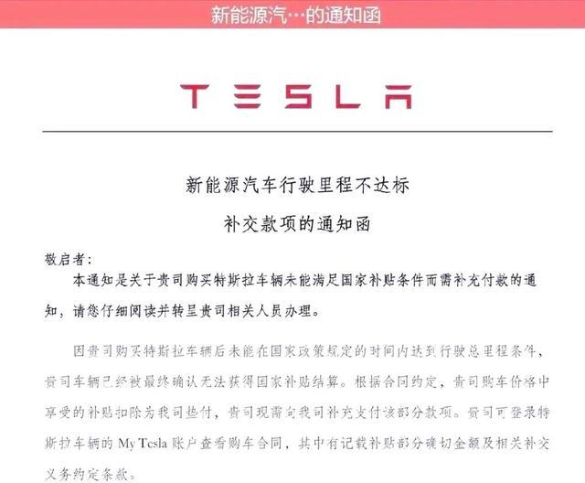 上述企业负责人称,此前其公司购买的特斯拉车辆屏幕中确实出现过一则《新能源汽车行驶里程不达标补交款项的通知函》,该《通知函》显示,“因贵司购买特斯拉后未能在国家政策规定时间内达到行驶总里程条件,贵司车辆已被最终确认无法获得国家补贴结算。根据合同约定,贵司购车价格中享受的补贴扣除为我司垫付,贵司现需要向我司补充支付该部分款项。请在收到本通知后7日内一次性支付至我司下方指定代收银行账户。”