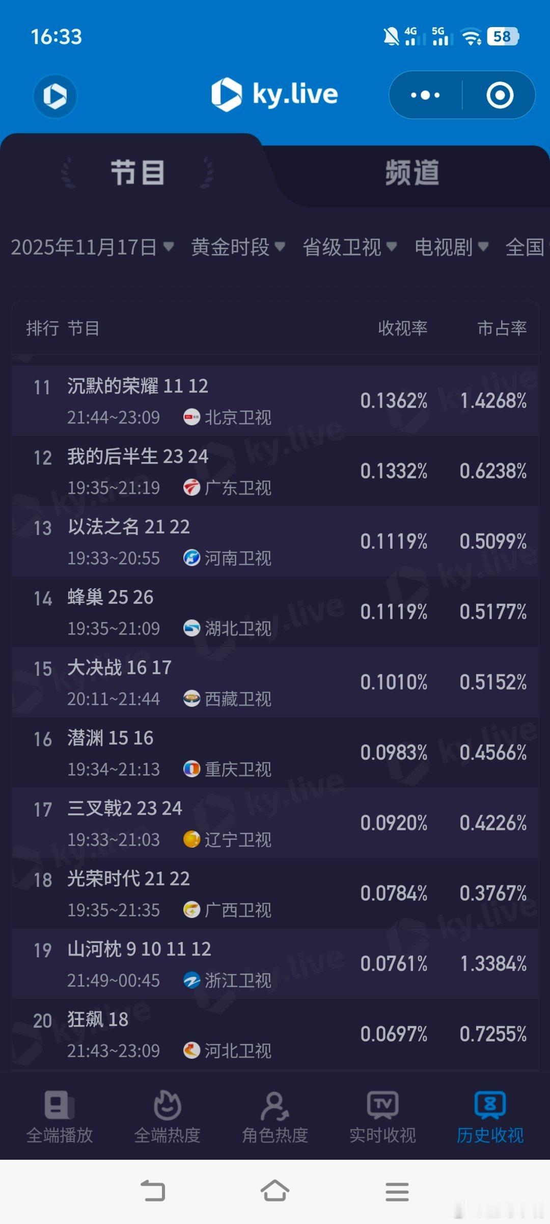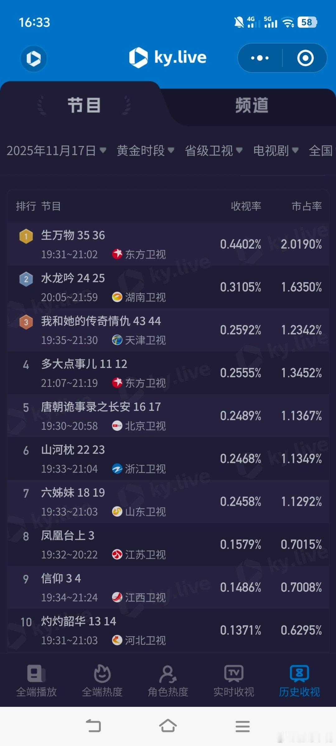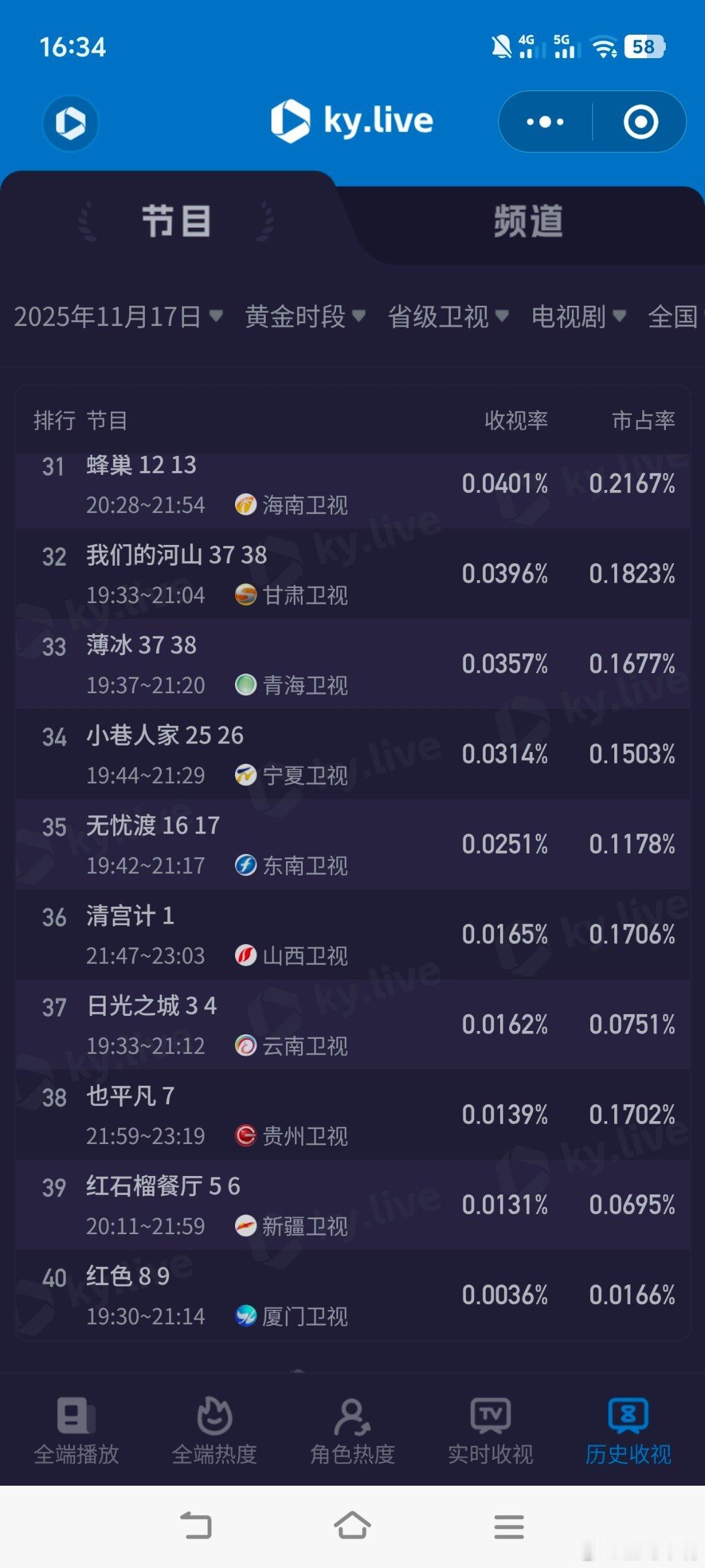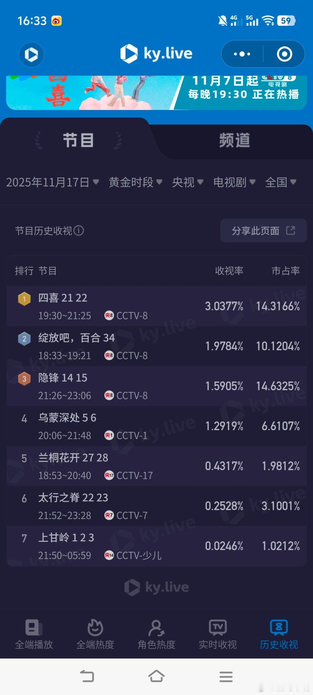 11月17日cvb收视日报乌蒙深处2.716,酷云1.2919,系数2.102四喜 2.444,酷云3.0377,系数0.804隐锋 1.718,生万物0.442,酷云0.4402,系数1.004山河枕0.310,酷云0.2468,系数1.256水龙吟0.232,酷云0.3105,系数0.747唐诡3 0.228,酷云0.2489,系数0.916