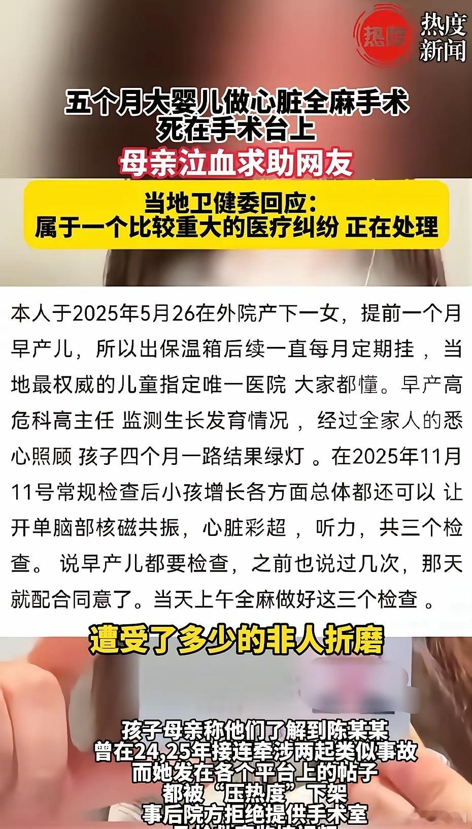 五个月大的早产儿,各种器官都没有发育完善,做手术的风险是非常大的,手术台上出现什么意外情况都有可能。作为医生肯定是知道的,但又为何做了手术呢?5个月有迫切需要手术的必要么?这个要调查清楚。目前当地卫健委已成立调查组,停诊是为了保护医生,让司法介入是正确的。希望调查能早日还原真相,给家属一个交代。