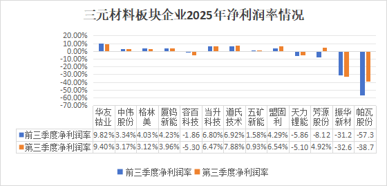 总的来看,2025年第三季度,湖南裕能等14家企业实现营收净利双增长(含亏损收窄和扭亏为盈企业);其中铁锂材料企业5家,三元材料9家;富临精工等3家企业处于增收不增利的尴尬状态;容百科技、合纵科技营收净利双降,德方纳米、振华新材、帕瓦股份虽然营收有所下降,但净利润反而实现增长(或亏损收窄)。