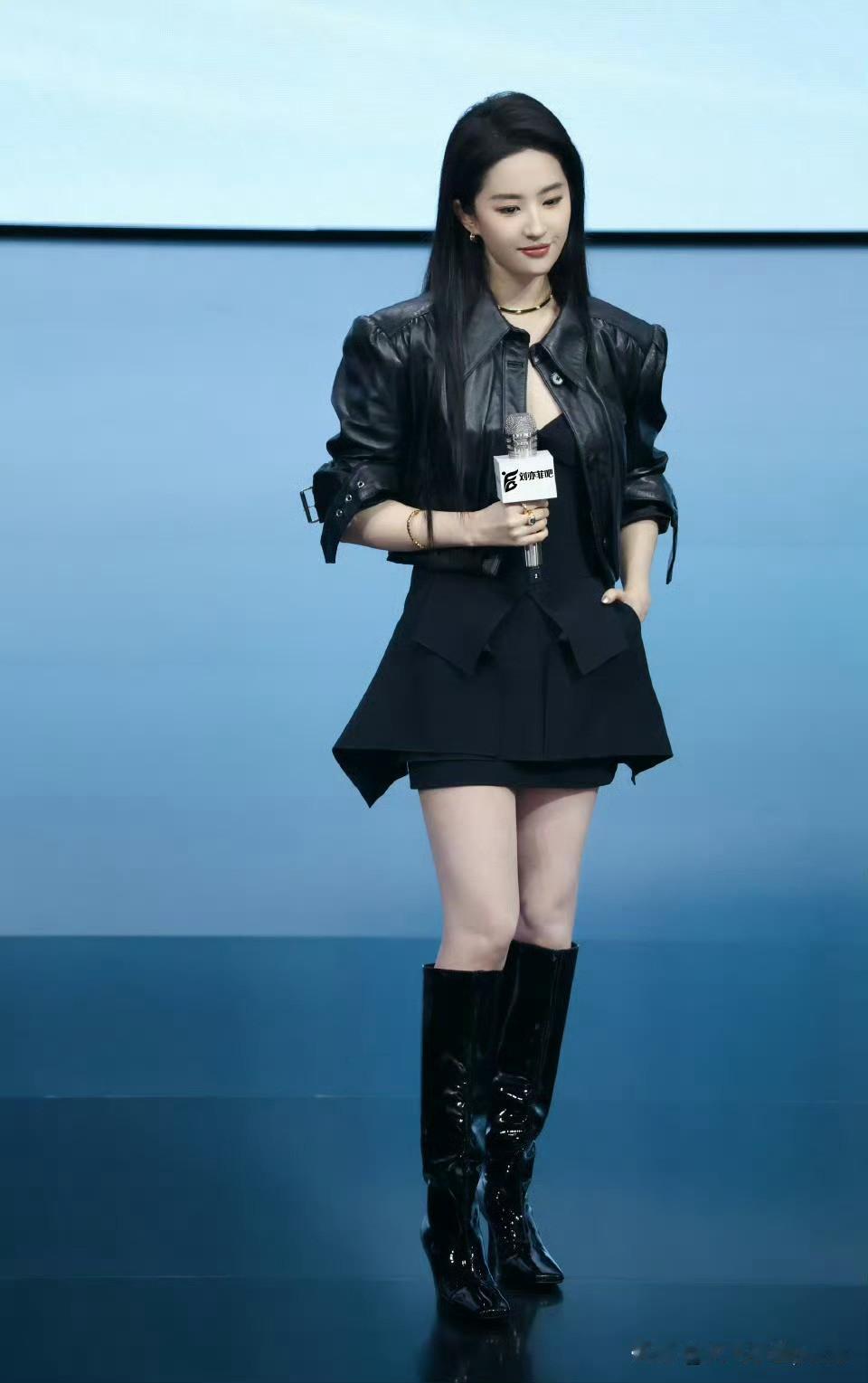 刘亦菲这身全黑造型真是把酷和美完美融合! 皮质短外套搭配短裙和长筒靴,又飒又性感