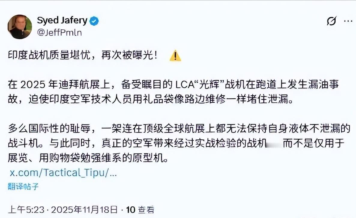 阿联酋迪拜的航展发生一件令人瞠目结舌的事件。印度空军参展的“光辉”战机在静态展示时机身出现了漏油。 更丢人的是,印度地勤人员居然找不到专业接油设备,情急之下拎来几个普通购物袋往机底下一塞,薄薄的塑料袋哪里兜得住油,没多久就渗得满地狼藉,被全世界媒体拍了个正着。 这哪是展示军工实力,分明是公开出糗!可千万别以为这是偶然事故,这背后藏着印度军工体系几十年都没解决的大问题,说出来能让人大跌眼镜。 “光辉” 战机这名字听着挺响亮,实际却是个 “扶不起的阿斗”。早在 1983 年印度就立项要造这款战机,当时想着 1995 年就能列装部队,结果硬生生拖到 2015 年才勉强交付,研发周期长达 32 年,比不少年轻人的年龄都大,延期整整 20 年! 原计划花点小钱搞自主研发,最后成本超支近 700%,简直是无底洞。更讽刺的是,号称 “国产战机”,核心部件却大半是进口的:发动机是美国的,雷达是以色列的,弹射座椅是英国的,就连空空导弹都要靠俄罗斯、以色列供应,自己连关键零件都造不明白,说白了就是个 “万国牌组装机”。 印度空军参谋长都忍不住痛批,2021 年订的 83 架 “光辉” 战机,好几年过去了一架都没交齐,这样的效率实在让人不敢恭维。 这已经不是 “光辉” 战机第一次在国际场合丢人了。2023 年迪拜航展上,它的主表演机起飞后座舱显示器突然黑屏,只能紧急返航;备份机刚上天又出电子系统故障,迫降后彻底无缘表演,一次航展两次掉链子。 到了 2024 年 3 月,更严重的事发生了,一架 “光辉” 战机在训练时直接坠毁,飞行员跳伞逃生,战机炸成了火球,这可是它服役后的首次坠毁事故。 连基本的飞行安全都保障不了,静态展示漏油反而显得不那么意外了。想想看,一款战机连地面静置都能漏油,要是在天上飞行时出现这种情况,后果不堪设想,飞行员的性命都得悬着。 其实 “光辉” 的囧态只是印度军工的一个缩影,他们的国防项目几乎没一个能按时完成的,延期率超过 60% 是常态。 就说那 “阿琼” 主战坦克,1974 年就开始研发,折腾到 2004 年才小批量列装,花了 30 年时间,结果印度陆军根本看不上,说它重量超标、发动机功率不足,最终只买了 124 辆,远低于原定的 1200 辆。 还有首艘国产航母 “维克兰特” 号,2009 年动工,2022 年才服役,造了 13 年,预算从 7 亿美元涨到 30 亿美元,超支 3 倍多。 更离谱的是,这艘航母用的特种钢材一开始不达标,动力系统、雷达都是进口的,整合时频频出问题,海试时故障不断,堪称 “难产典范”。 为啥印度军工总是掉链子?核心问题就是眼高手低、基础薄弱。总想一口吃成胖子,既要搞自主研发,又没掌握核心技术,关键零件依赖进口,整合起来又漏洞百出。 就像 “光辉” 战机,把各国零件凑在一起,却解决不了兼容性问题,密封系统不过关导致漏油,航电系统不匹配引发故障,这些都是必然结果。 更让人无语的是,他们的维护水平也差得离谱,在迪拜航展这种重要场合,地勤人员居然连专业接油设备都没准备,只能用购物袋应急,这哪里是专业军工的样子,简直是应付了事。 印度斯坦航空公司作为主要制造商,管理混乱早就出了名,他们生产的苏 - 30MKI 战机妥善率还不到 50%,经常发生坠机事故,让人根本没法信任他们的产品。 再看看其他国家的同类战机,同样是轻型战斗机,人家研发周期大多在 10 年左右,服役后故障极少,更不会出现静态展示漏油这种低级错误。 印度花了 30 多年,投入海量资金,造出的战机不仅性能不达标,可靠性还极差,连自家海军都拒绝采购舰载版,外销更是屡屡碰壁,马来西亚招标最终选了韩国战机,其他意向国也都持观望态度。这样的产品,就算再吹得天花乱坠,实际表现也骗不了人。 迪拜航展上的购物袋接油,看似是个尴尬的小插曲,实则暴露了印度军工体系深层次的弊病:研发效率低下、核心技术缺失、整合能力薄弱、维护水平落后。 这些问题不是一天两天形成的,也不是靠吹牛皮就能解决的。印度总想靠着 “组装” 实现国防自主,却忽视了基础工业和研发能力的积累,最终只能造出 “金玉其外败絮其中” 的产品。 “光辉” 战机的名字里满是希望,可实际表现却黯淡无光,这次的漏油事件不过是它众多囧态中的一个,要是印度军工不解决根本问题,未来还会闹出更多笑话。这样的军工水平,别说撑起国防安全,恐怕连在国际舞台上不丢人都难!