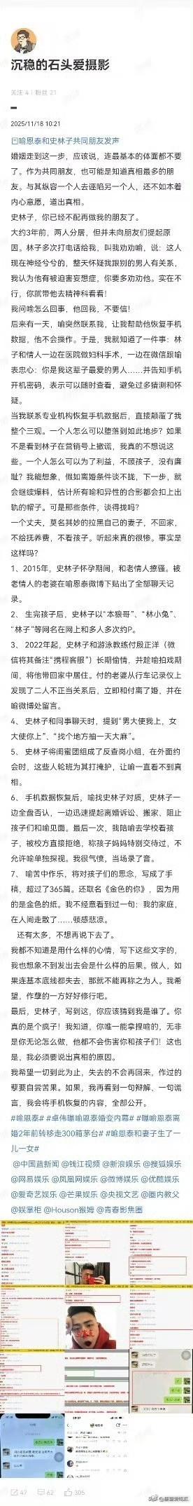 喻恩泰事件迎来反转 自称喻恩泰朋友的网友出来回应了 先说话的不代表有理,沉默的反而因为孩子,因为自己的良心承受一切,难怪喻恩泰这两年拍的戏,风格都变了,艺术来源于生活又高于生活真没说错。 喻恩泰朋友发文有图有真相,在他的讲述里,史林子撒谎成性,并且还多次出墙,不让见孩子,喻恩泰老师就是太要面子,太拉不下脸,为了孩子一直隐忍,真的是欺负老实人。
