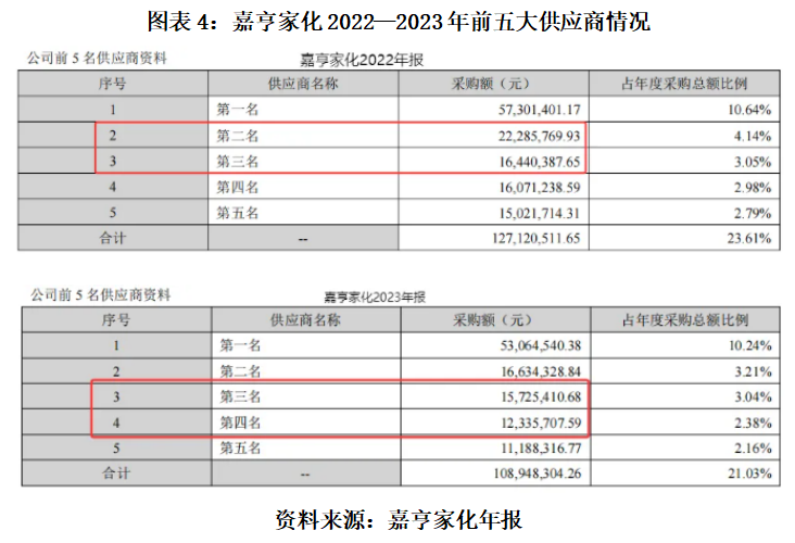 但据嘉亨家化2022年年报,嘉亨家化对未具名的第二大、第三大供应商的采购金额分别为2228.58万元、1644.04万元,与江天科技披露的销售数据存在13.41万元、571.13万元的差额。