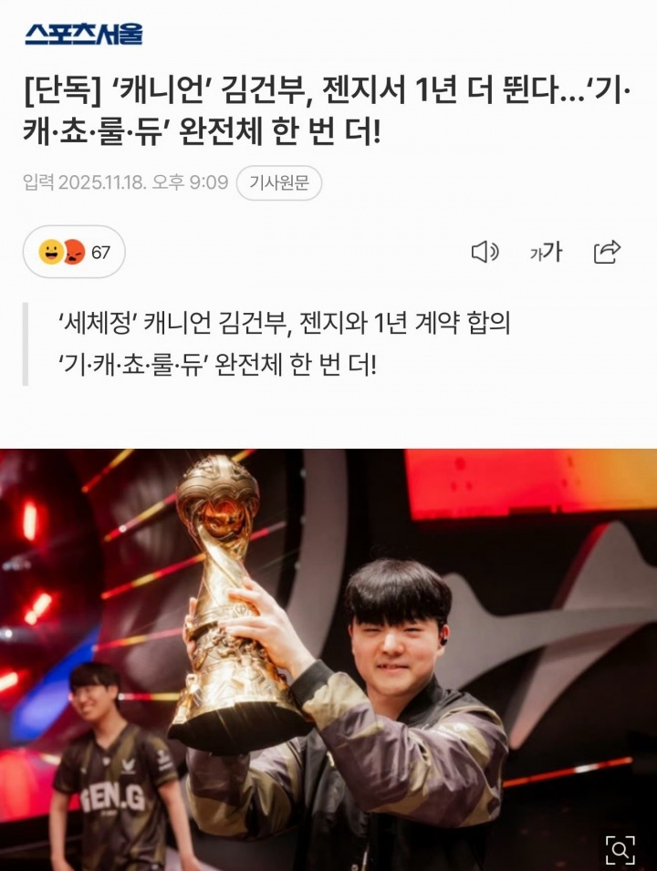 直播吧11月18日讯来自韩媒《首尔体育》独家爆料,已经离开GEN的打野选手Canyon与GEN打成合作,成功续约一年。