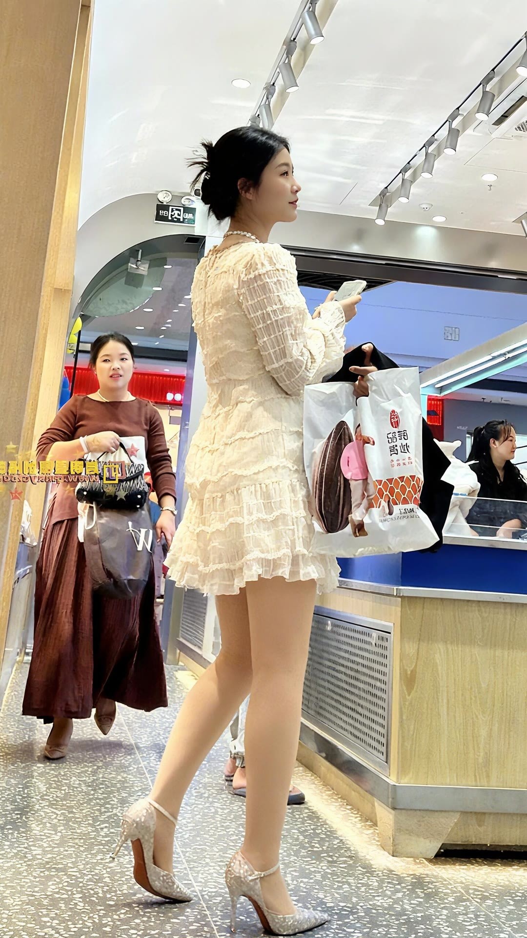 奶杏褶皱裙+细闪高跟,随手一拍都是温柔暴击